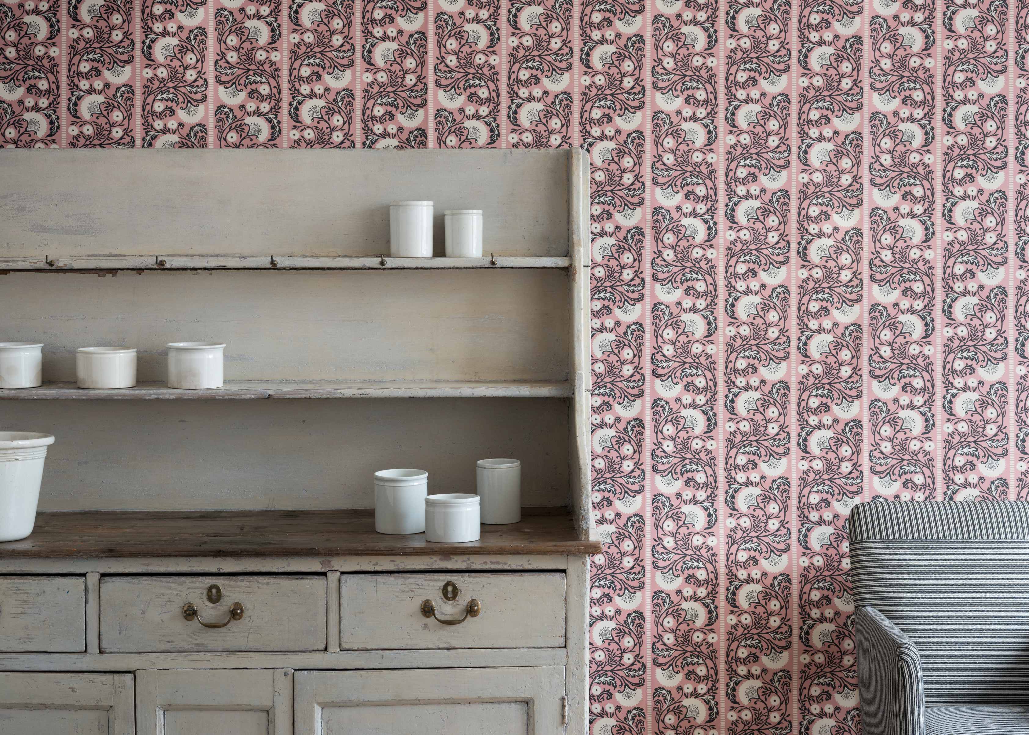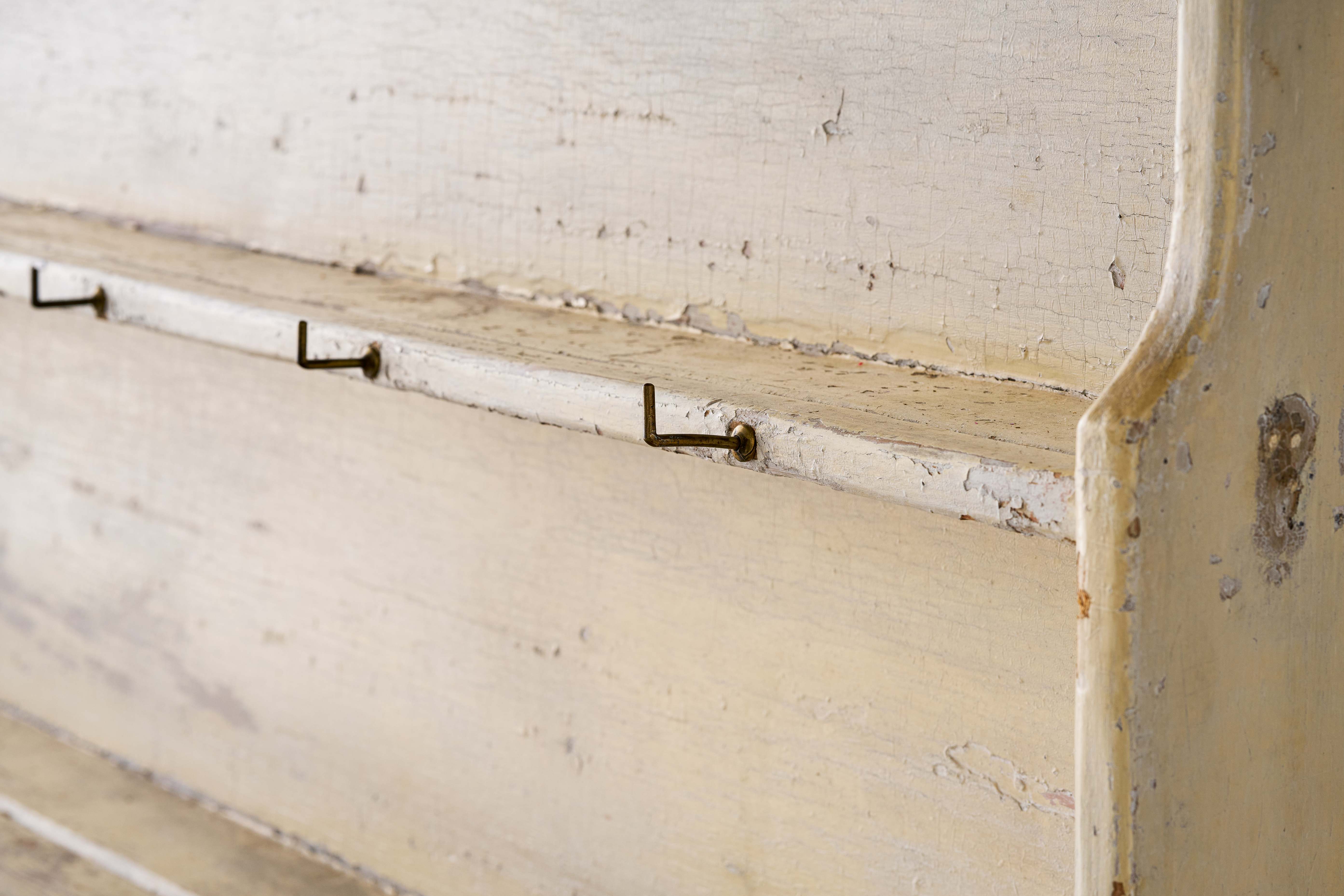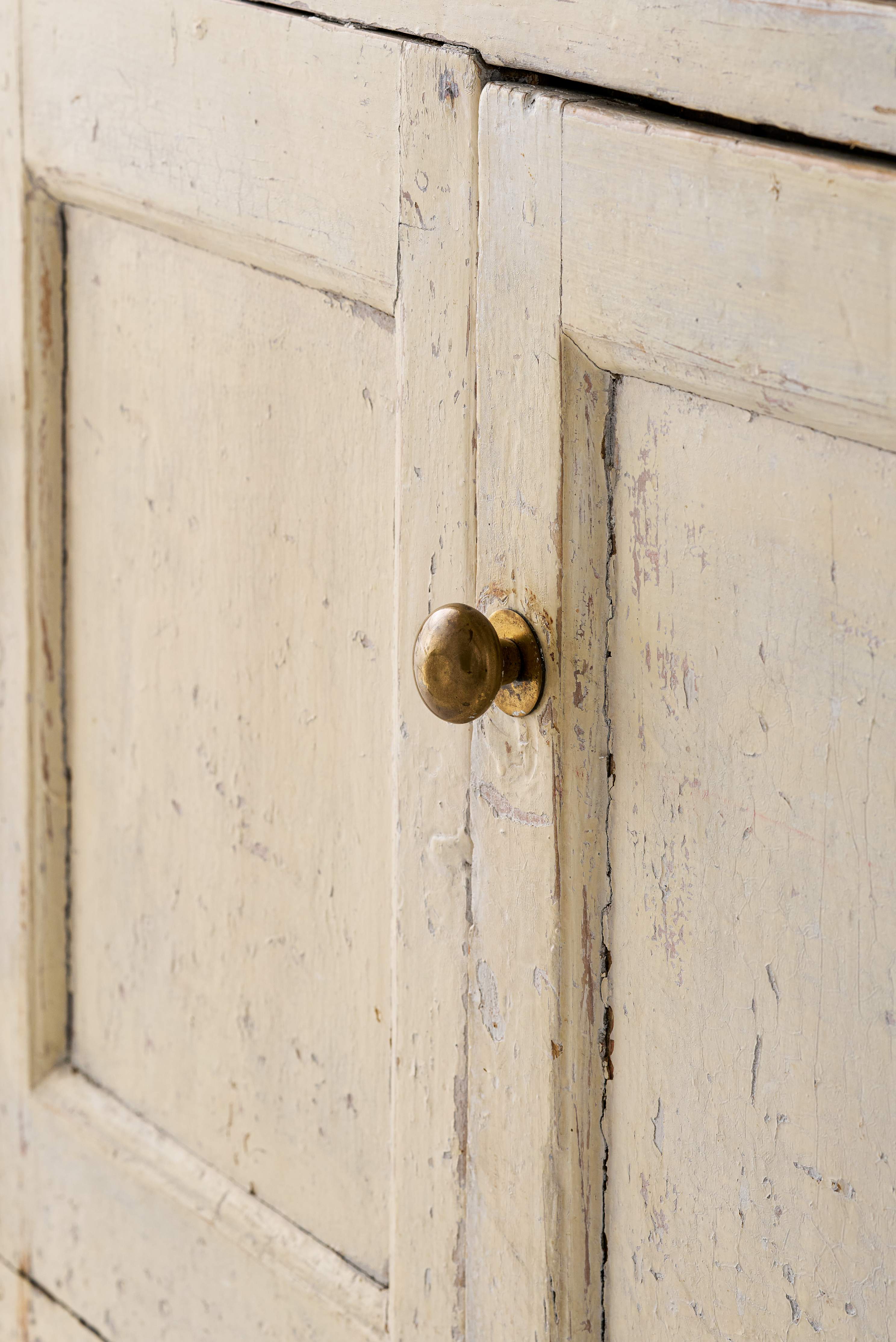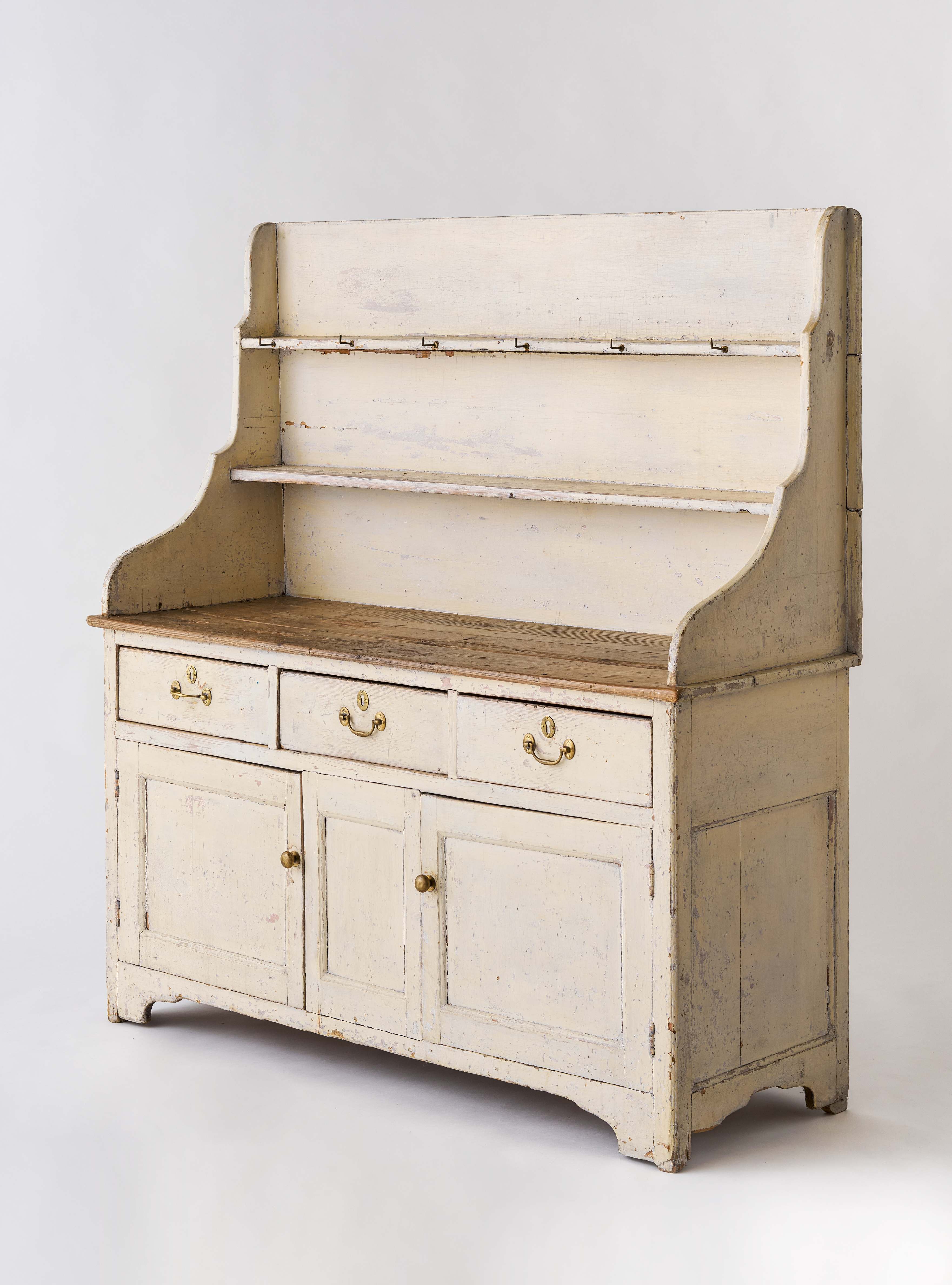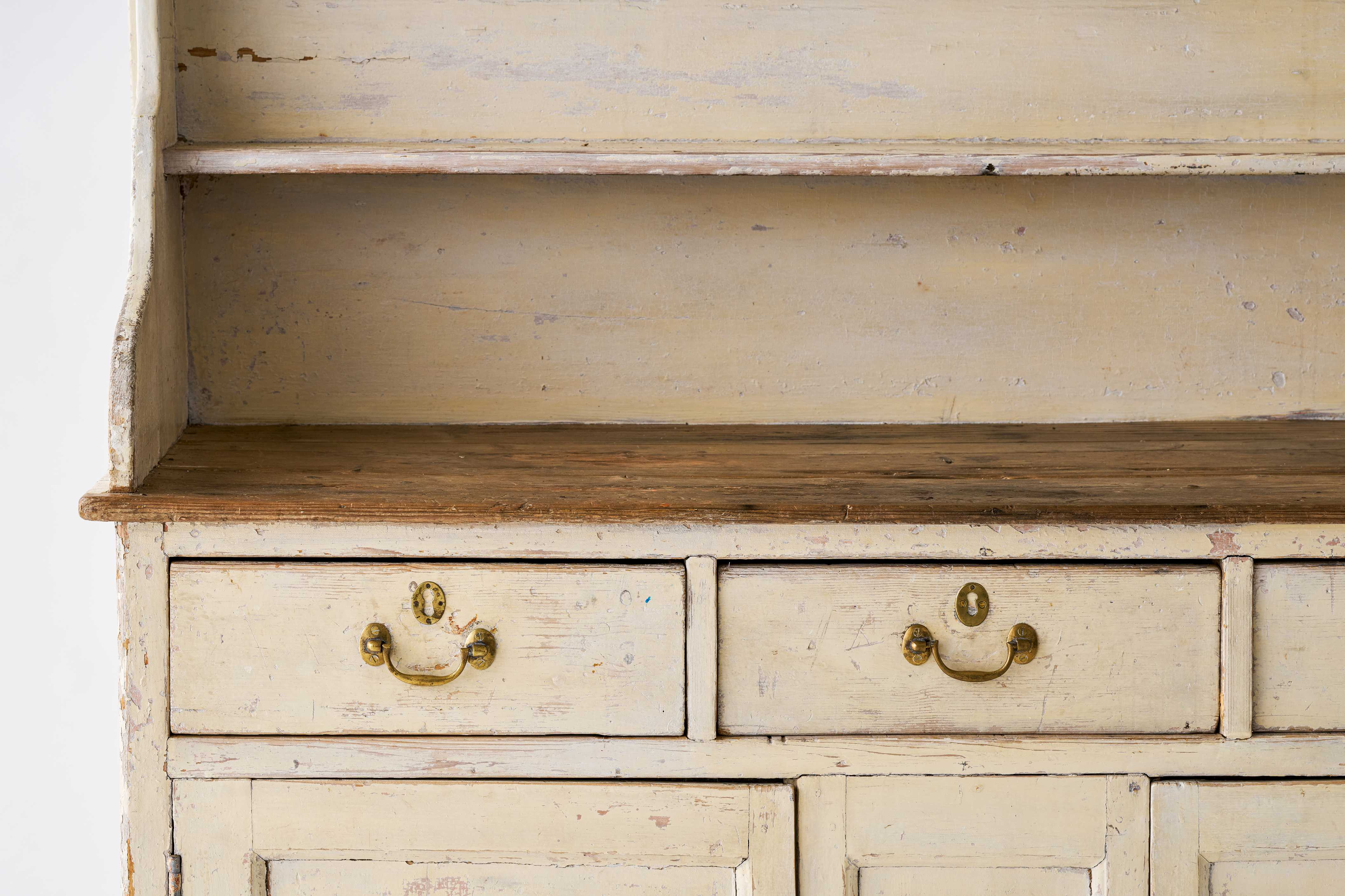 A stunning English painted pine dresser in original paintwork, circa 1880. Wear consistent with age and features three deep drawers above cupboards, with display shelves above and a row of hooks below.