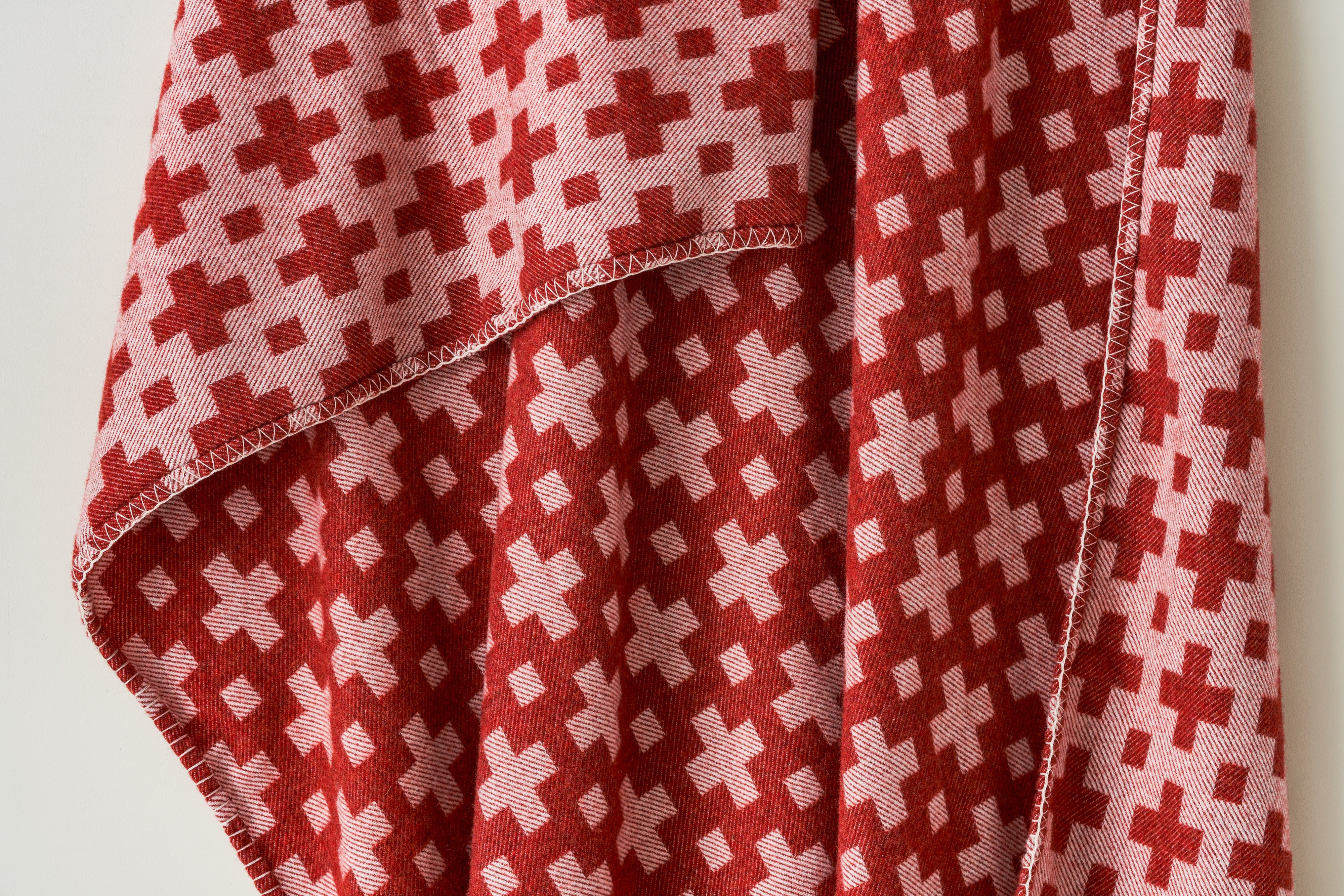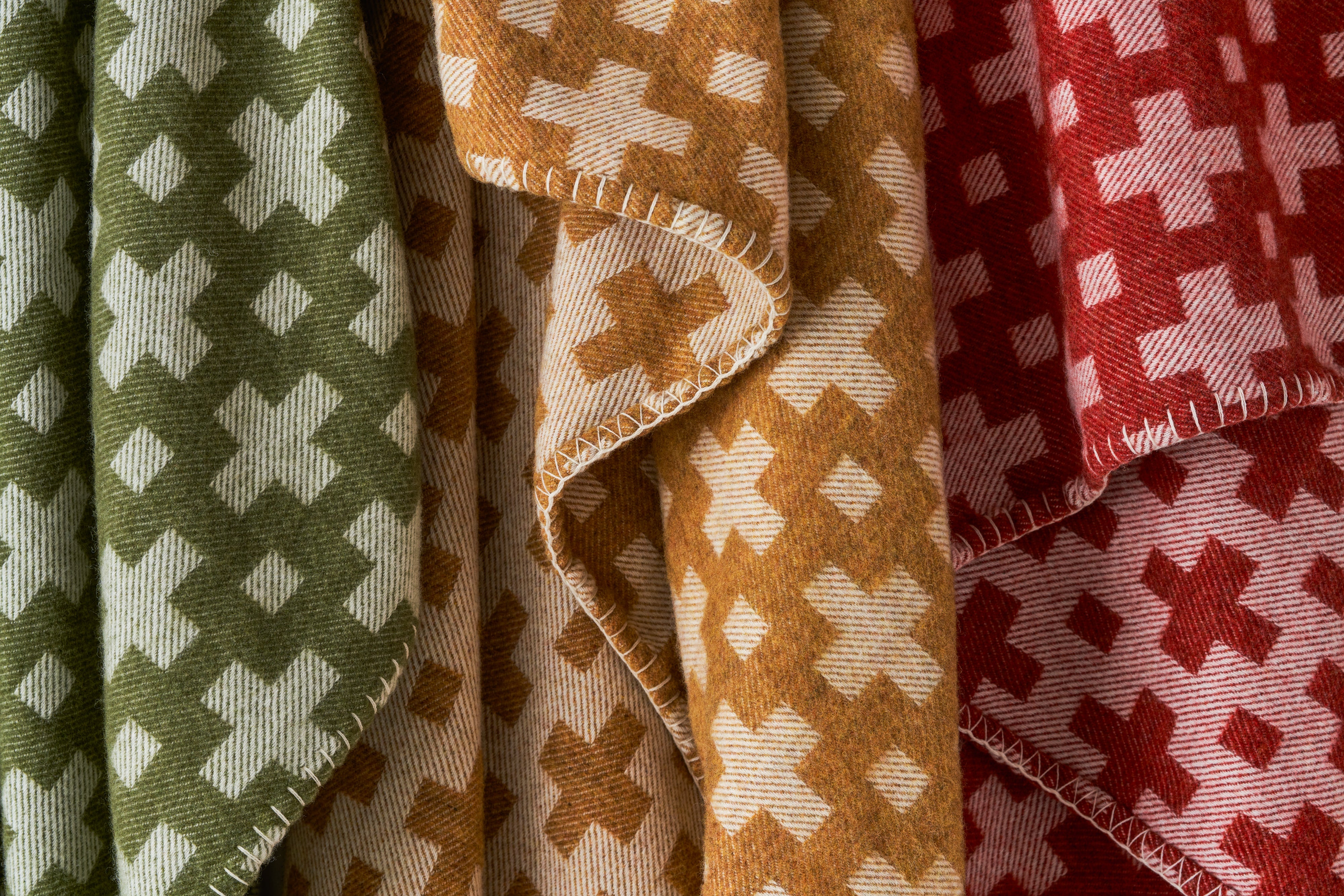 Introducing our limited edition Kiss Cross blankets, which are inspired by the design of our recently launched Kiss Cross fabric collection. Each blanket has been expertly woven in the north of England, in a mill that's been operating for over 100 years, and they are made of 100% lambswool. Similarly to our fabrics, each blanket is reversible, and they feature a blanket stitch edge.