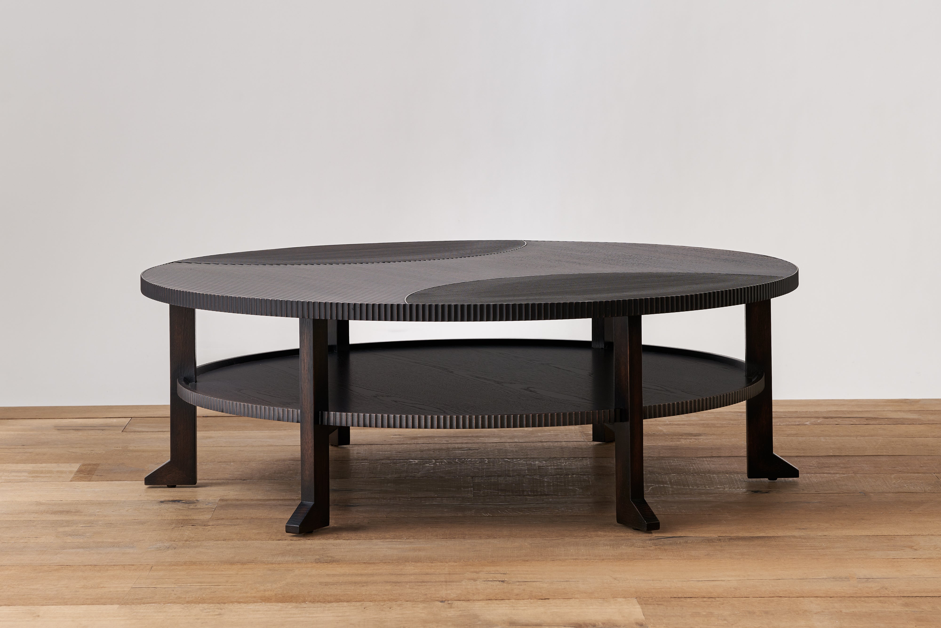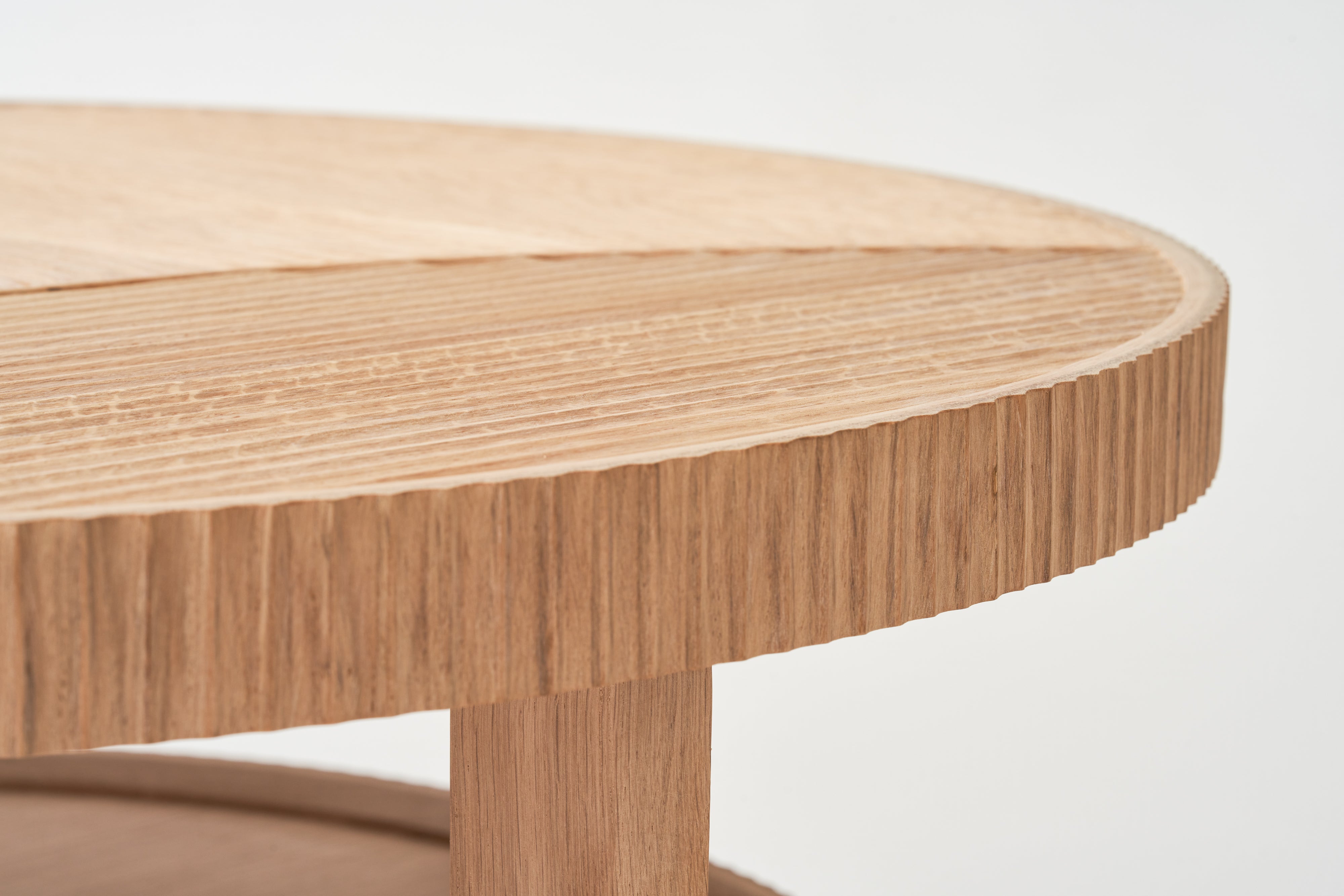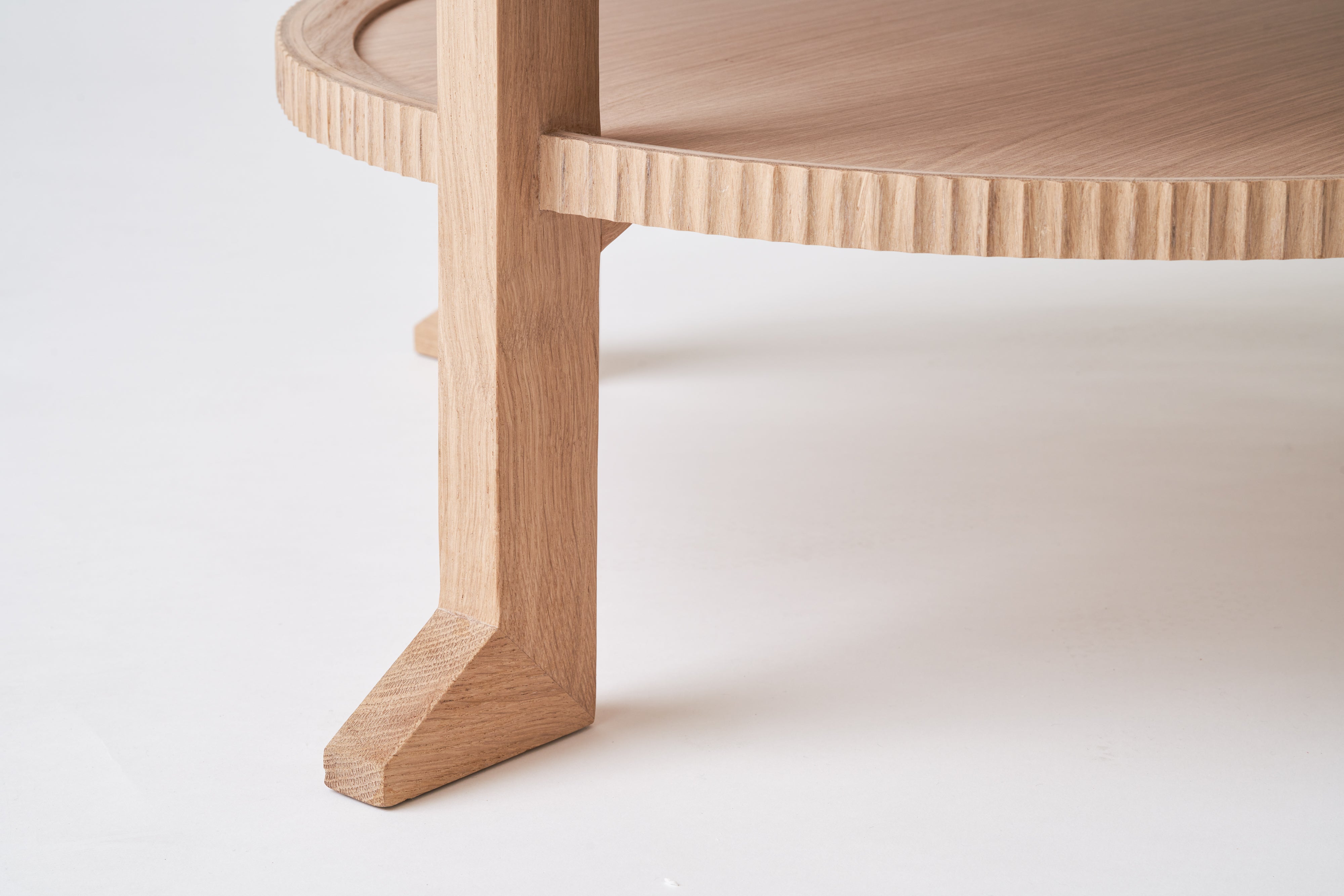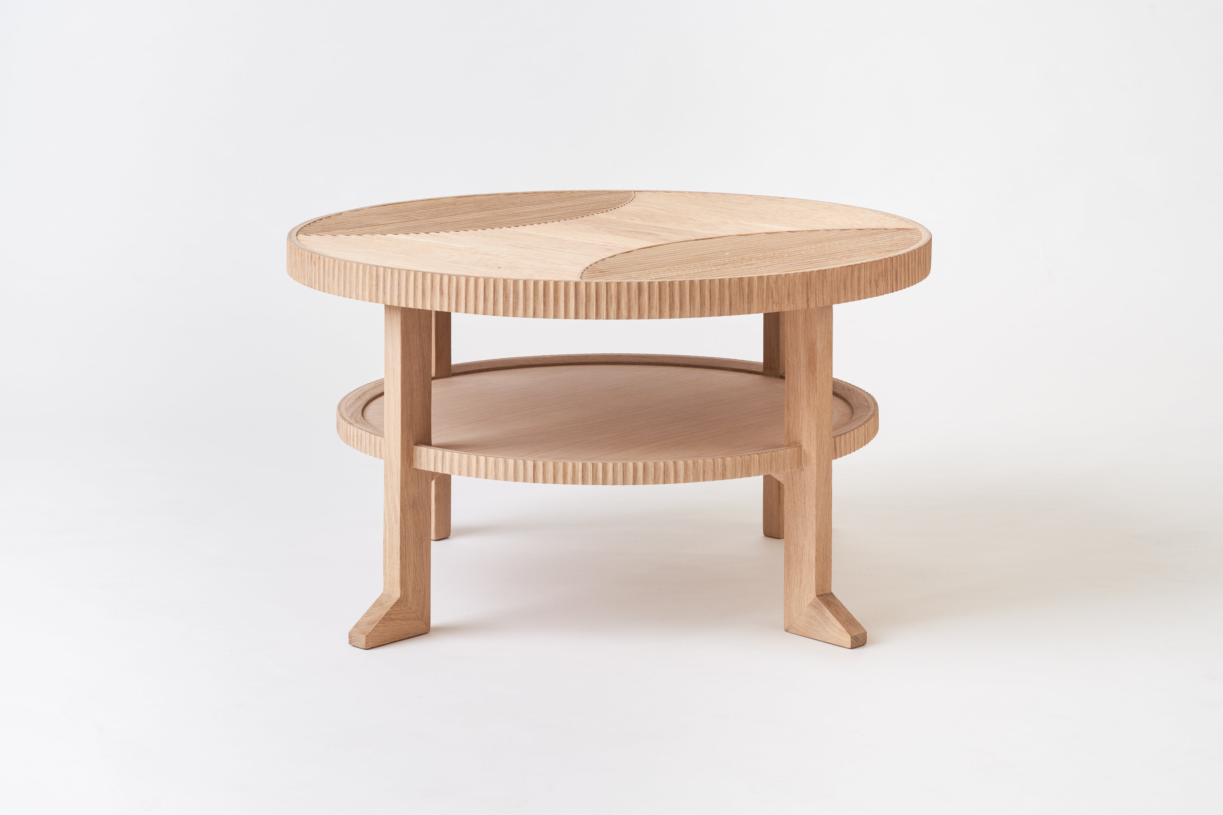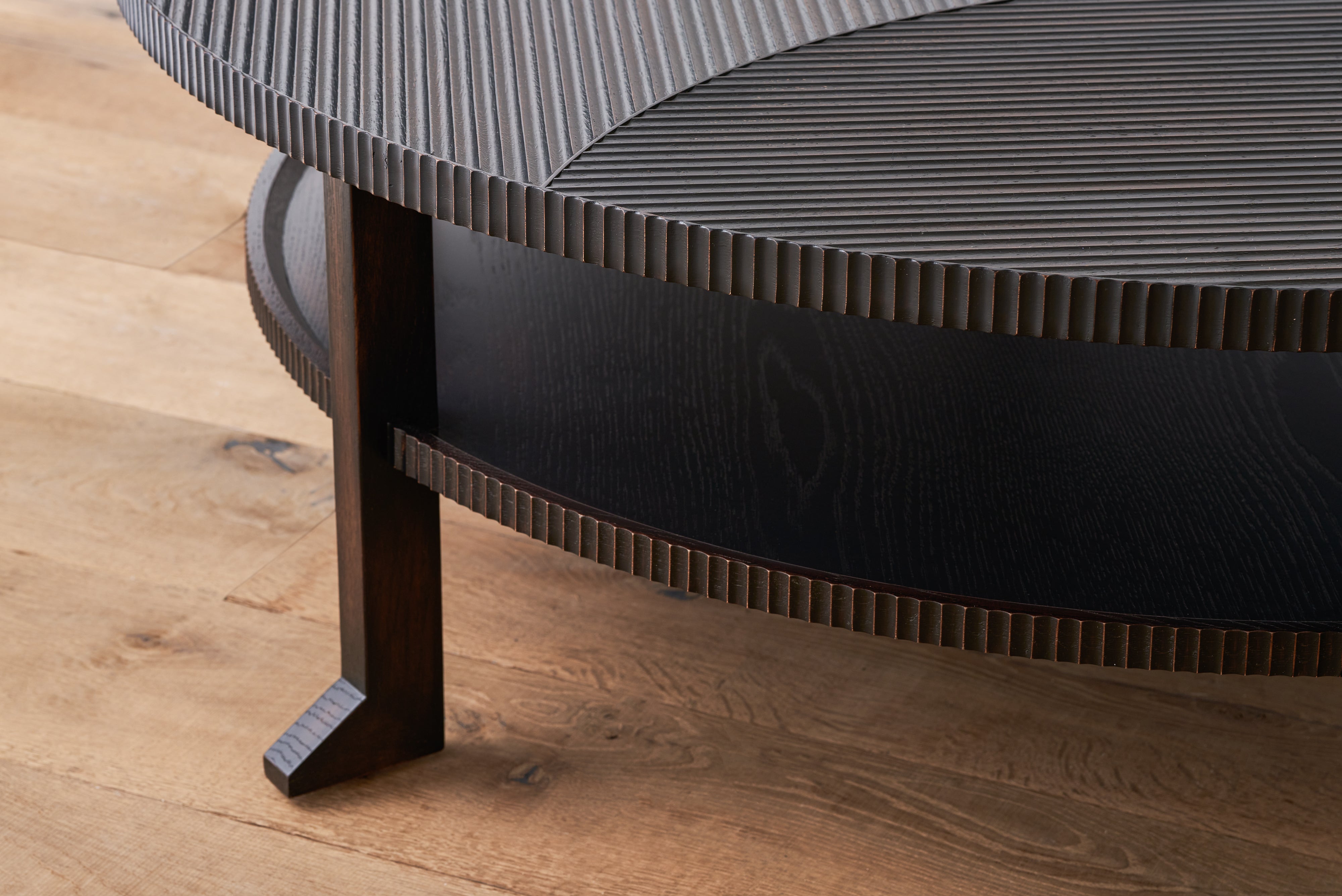 The Noughts & Crosses collection was inspired by an antique bamboo dining table sourced by Susie at a French market many years ago. It featured a cotton reel round base and contrasting crossed feet, a play on direction and contrast which the new collection mimics through fluting as well as differentiation of the wood grain direction.