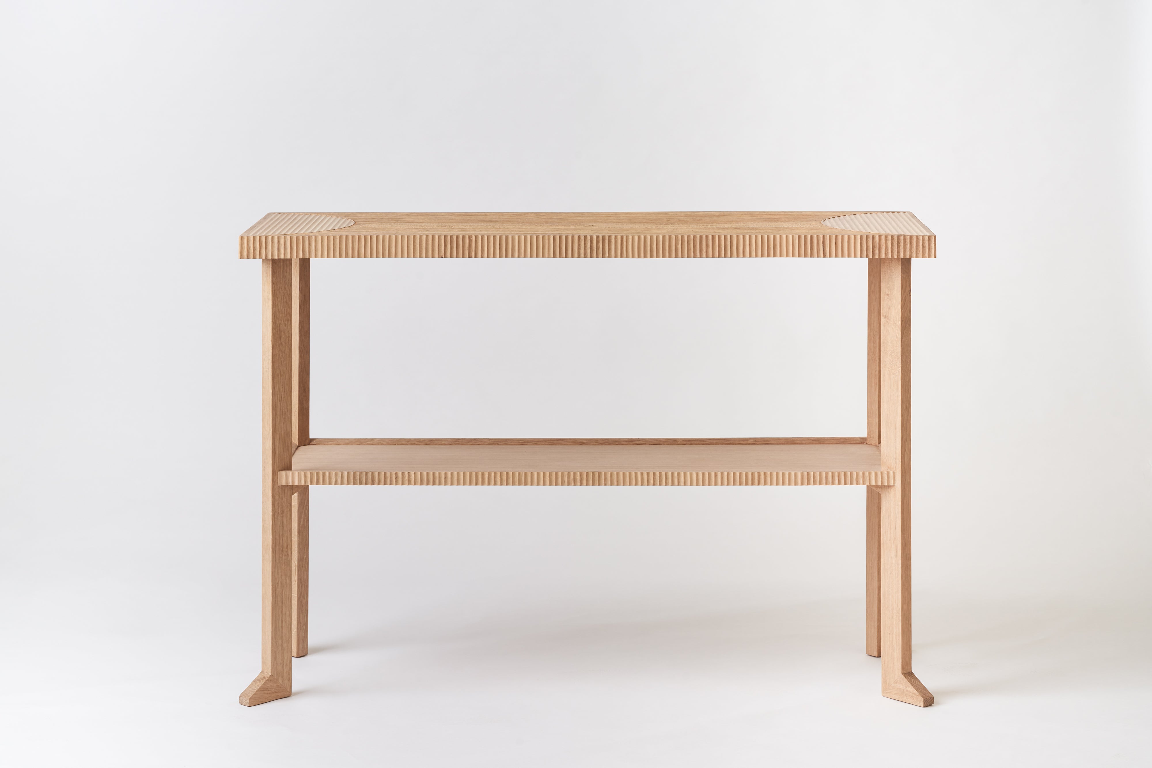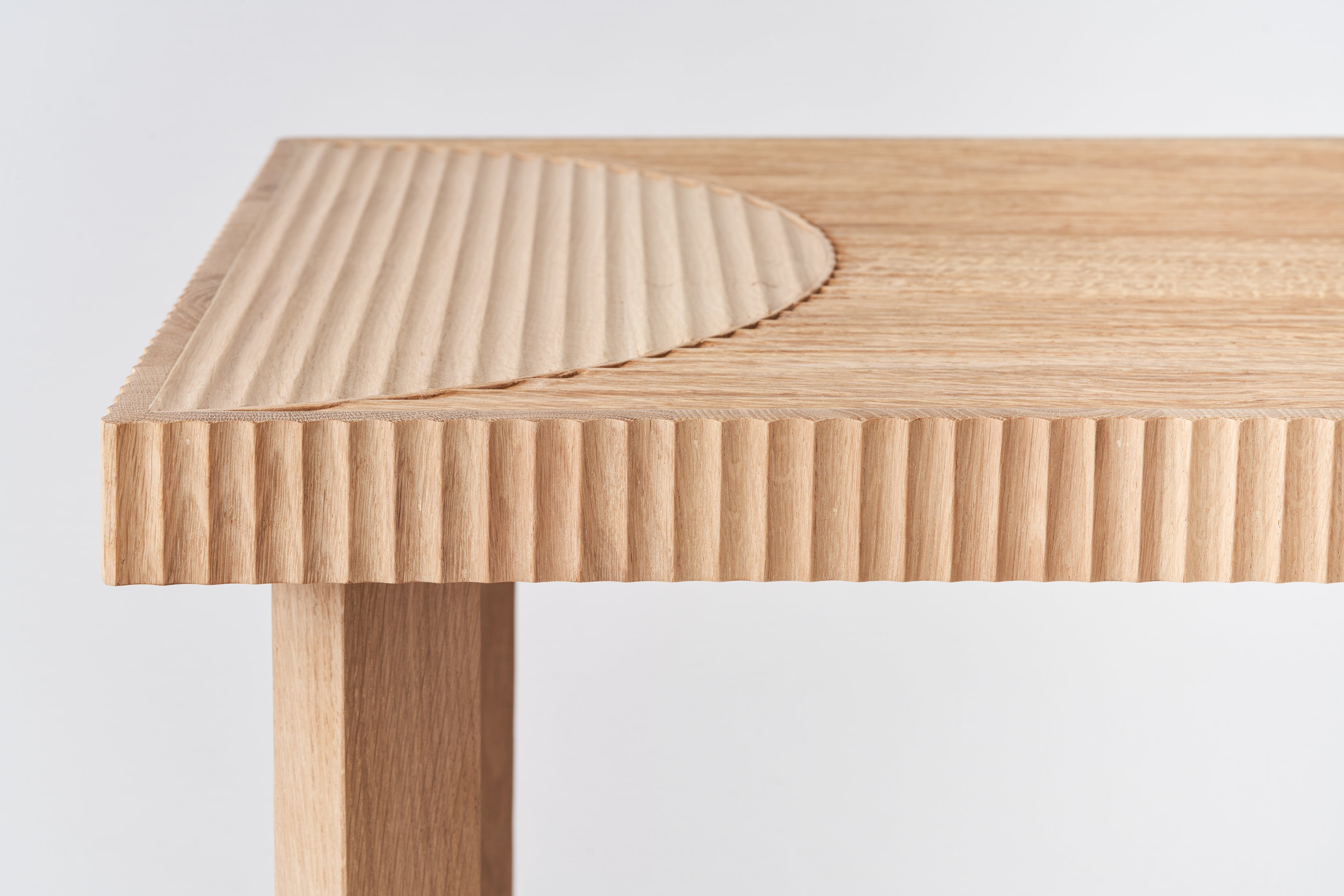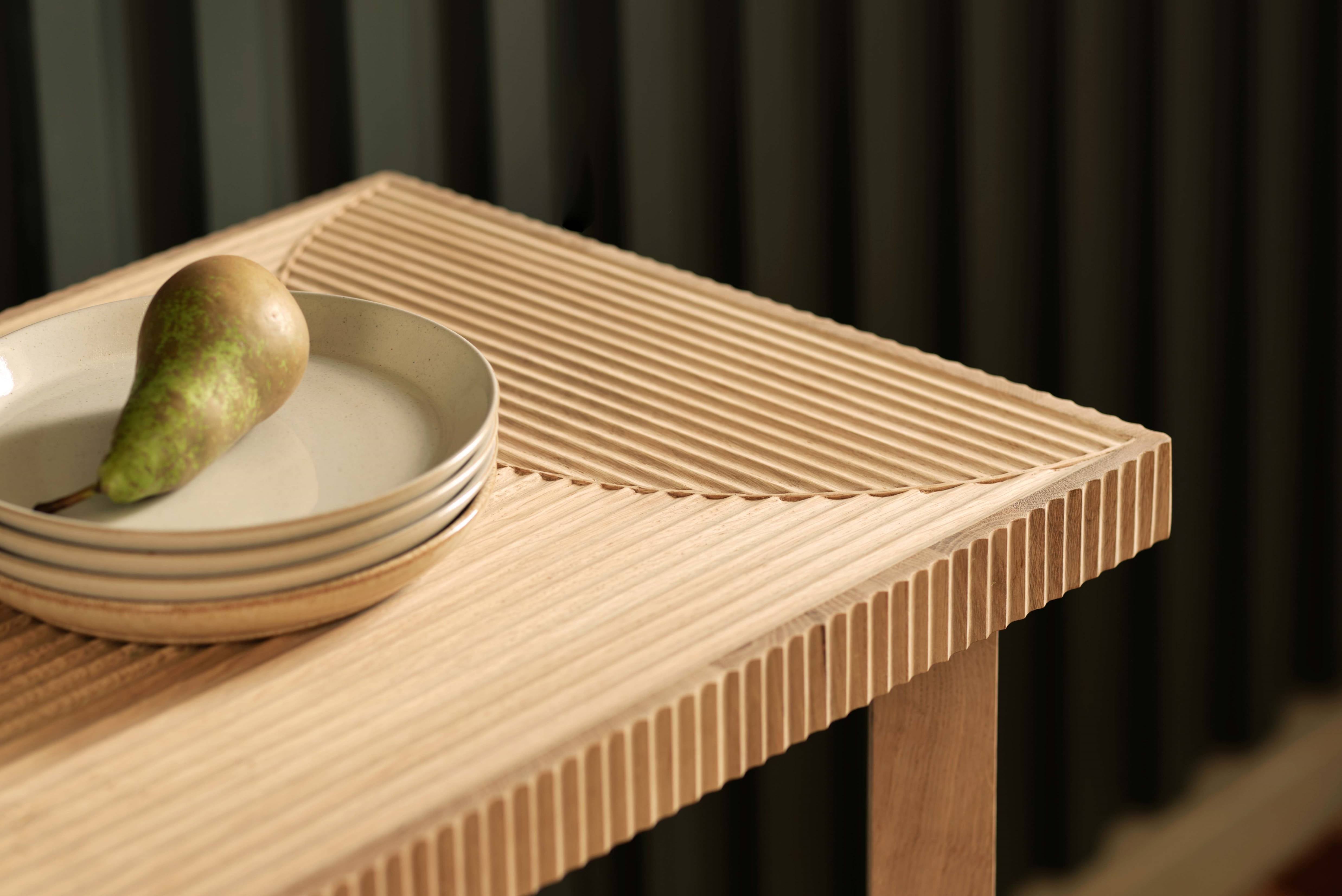 The Noughts & Crosses collection was inspired by an antique bamboo dining table sourced by Susie at a French market many years ago. It featured a cotton reel round base and contrasting crossed feet, a play on direction and contrast which the new collection mimics through fluting as well as differentiation of the wood grain direction.