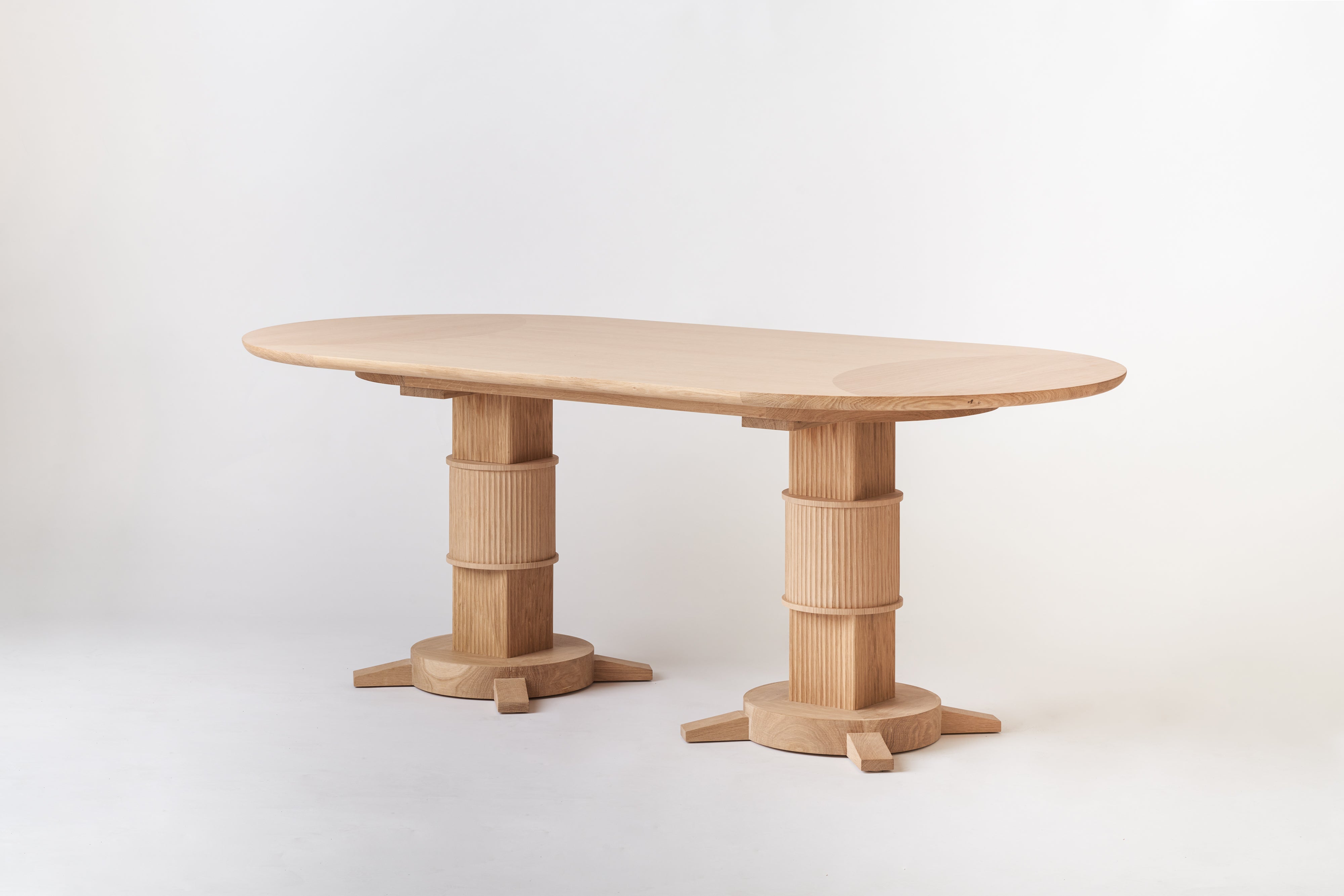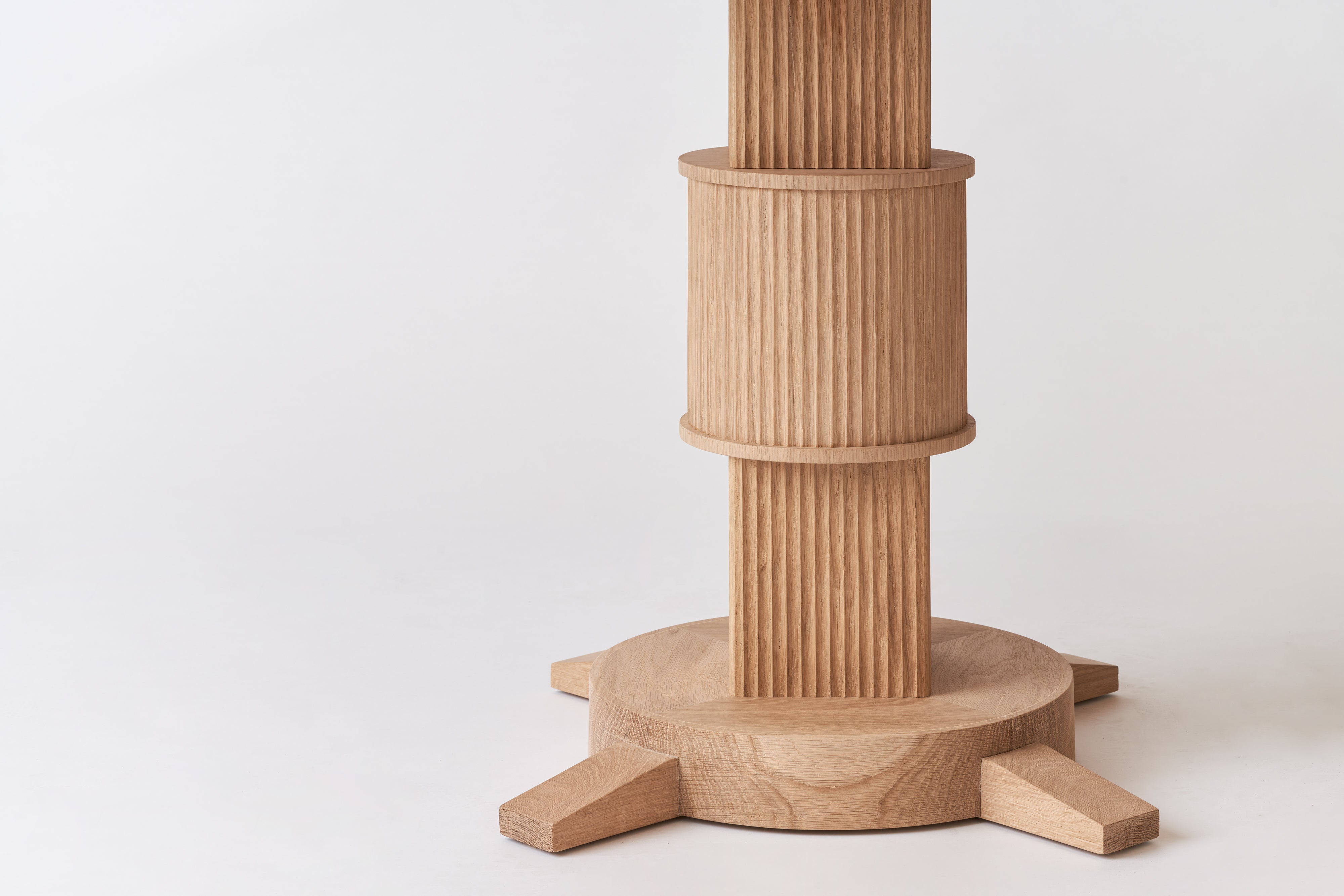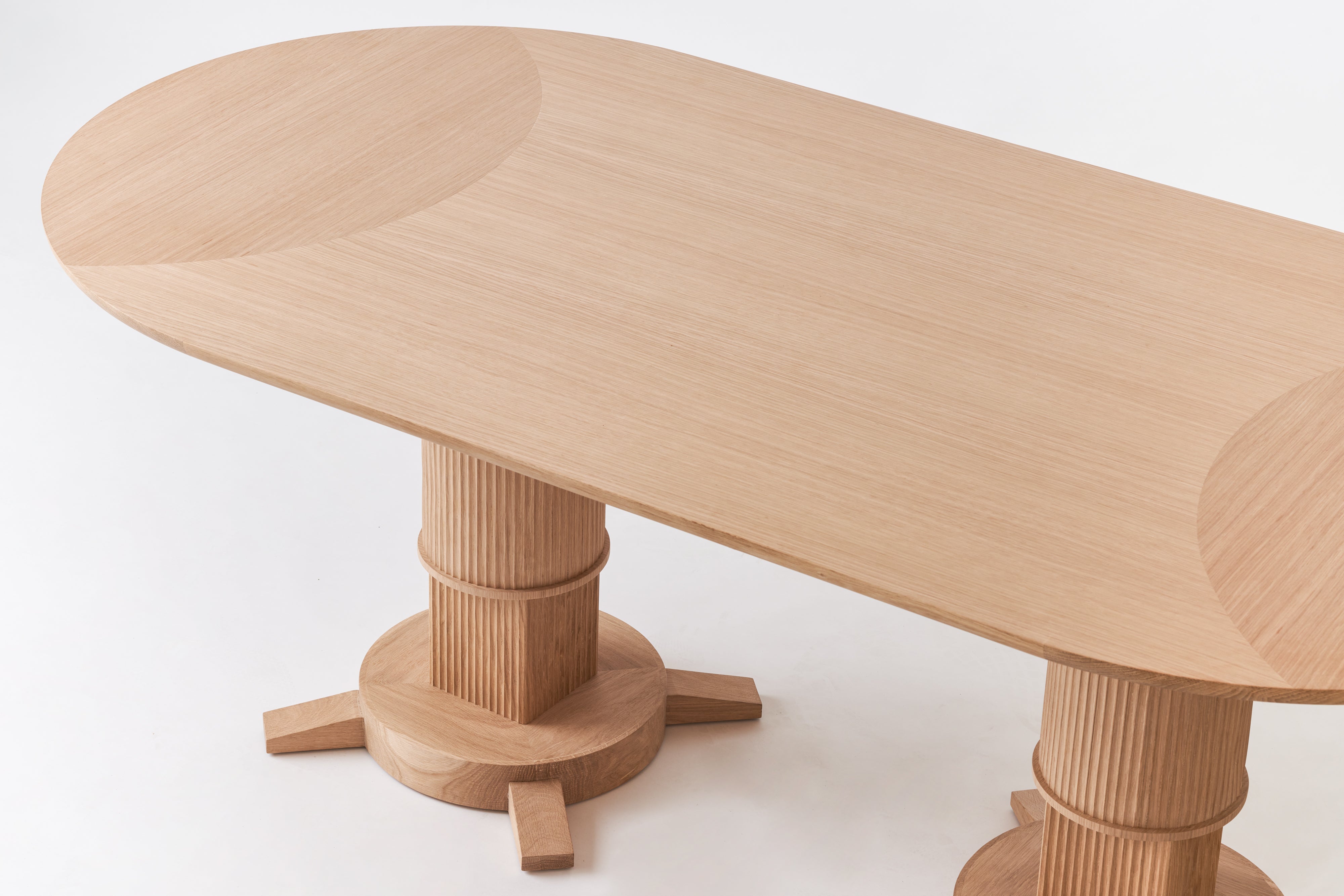 The Noughts & Crosses collection was inspired by an antique bamboo dining table sourced by Susie at a French market many years ago. It featured a cotton reel round base and contrasting crossed feet, a play on direction and contrast which the new collection mimics through fluting as well as differentiation of the wood grain direction.