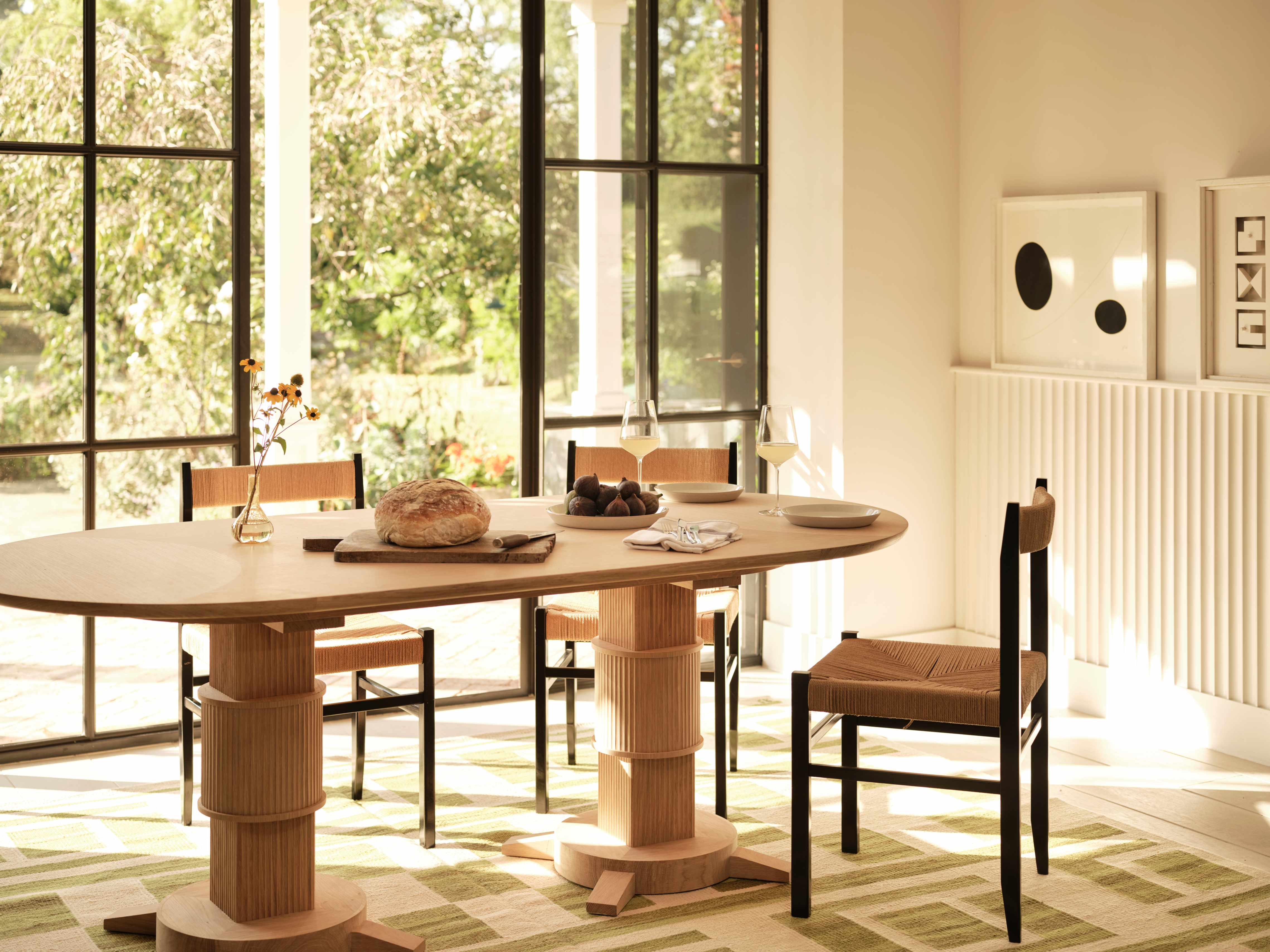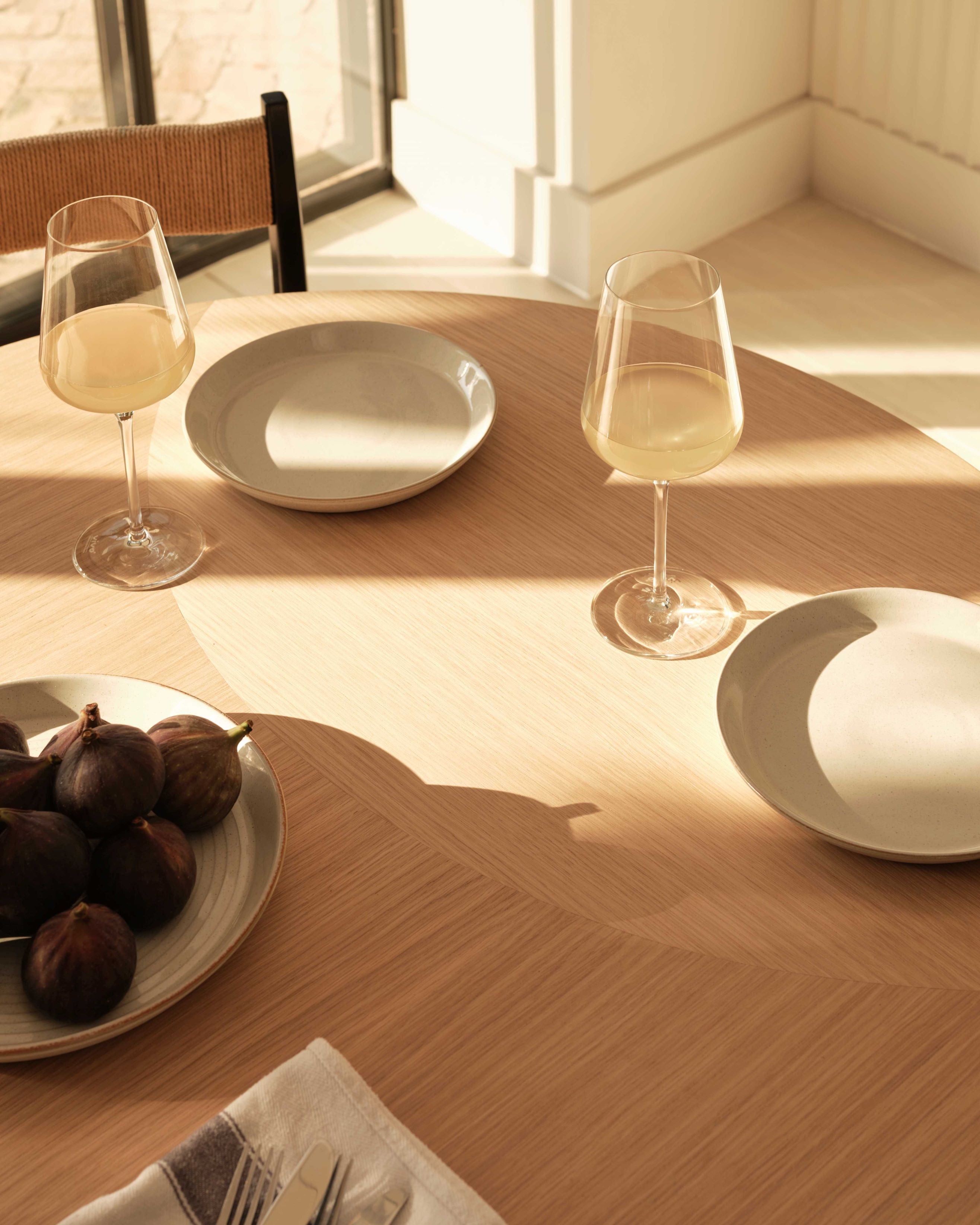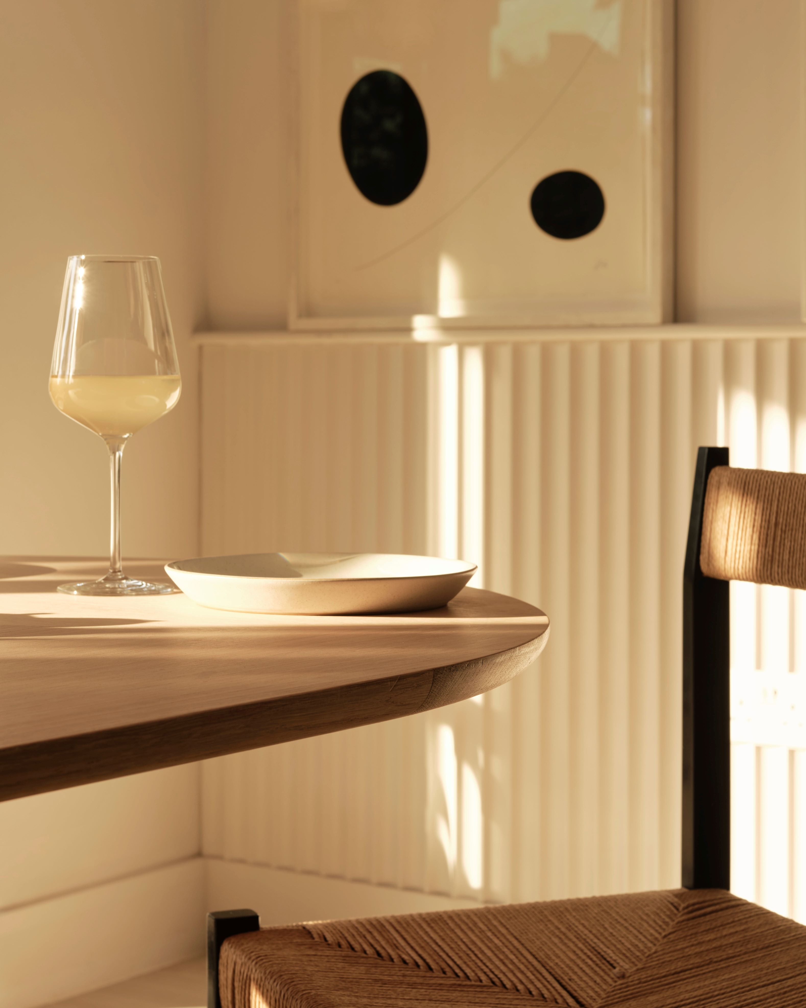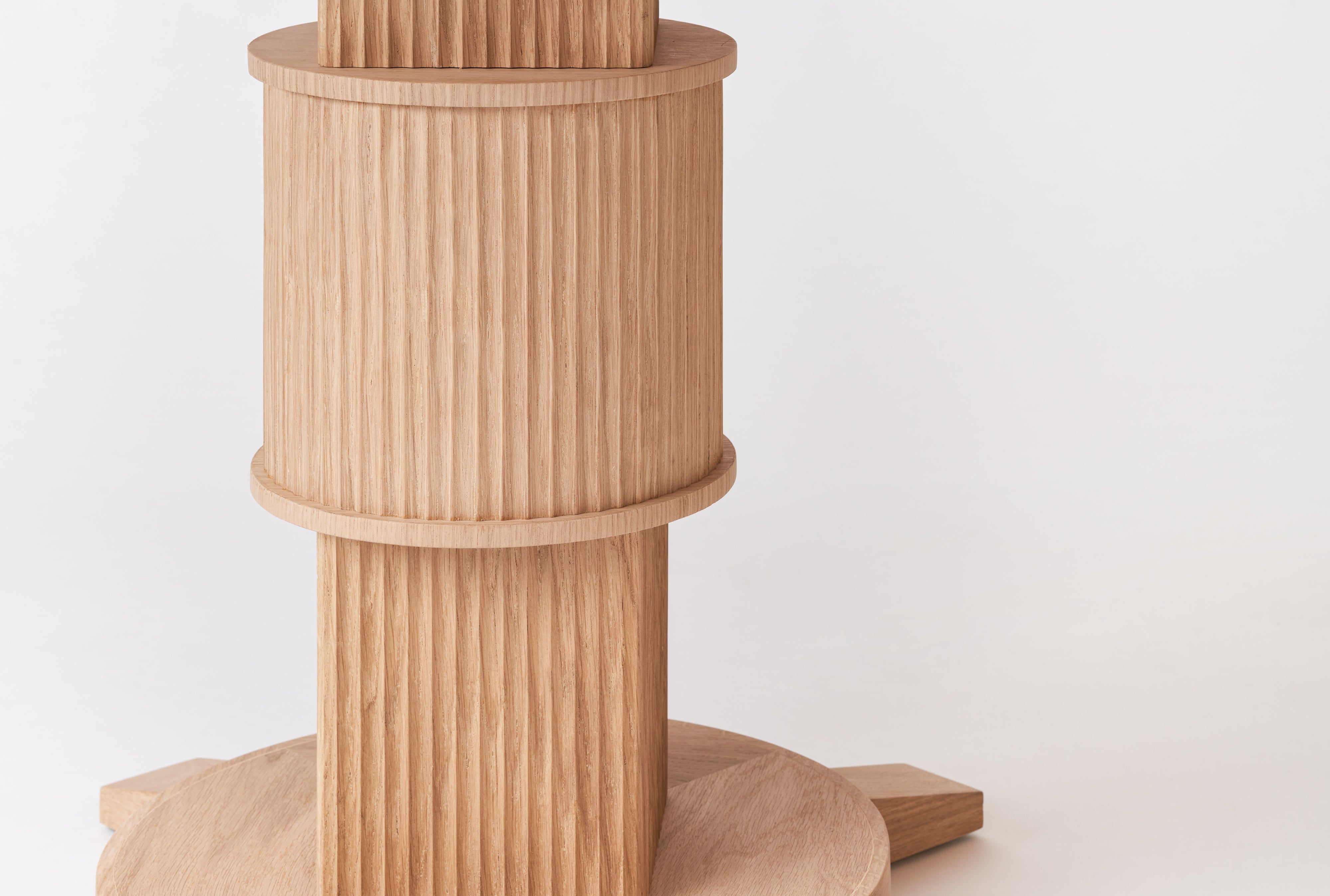The Noughts & Crosses collection was inspired by an antique bamboo dining table sourced by Susie at a French market many years ago. It featured a cotton reel round base and contrasting crossed feet, a play on direction and contrast which the new collection mimics through fluting as well as differentiation of the wood grain direction.