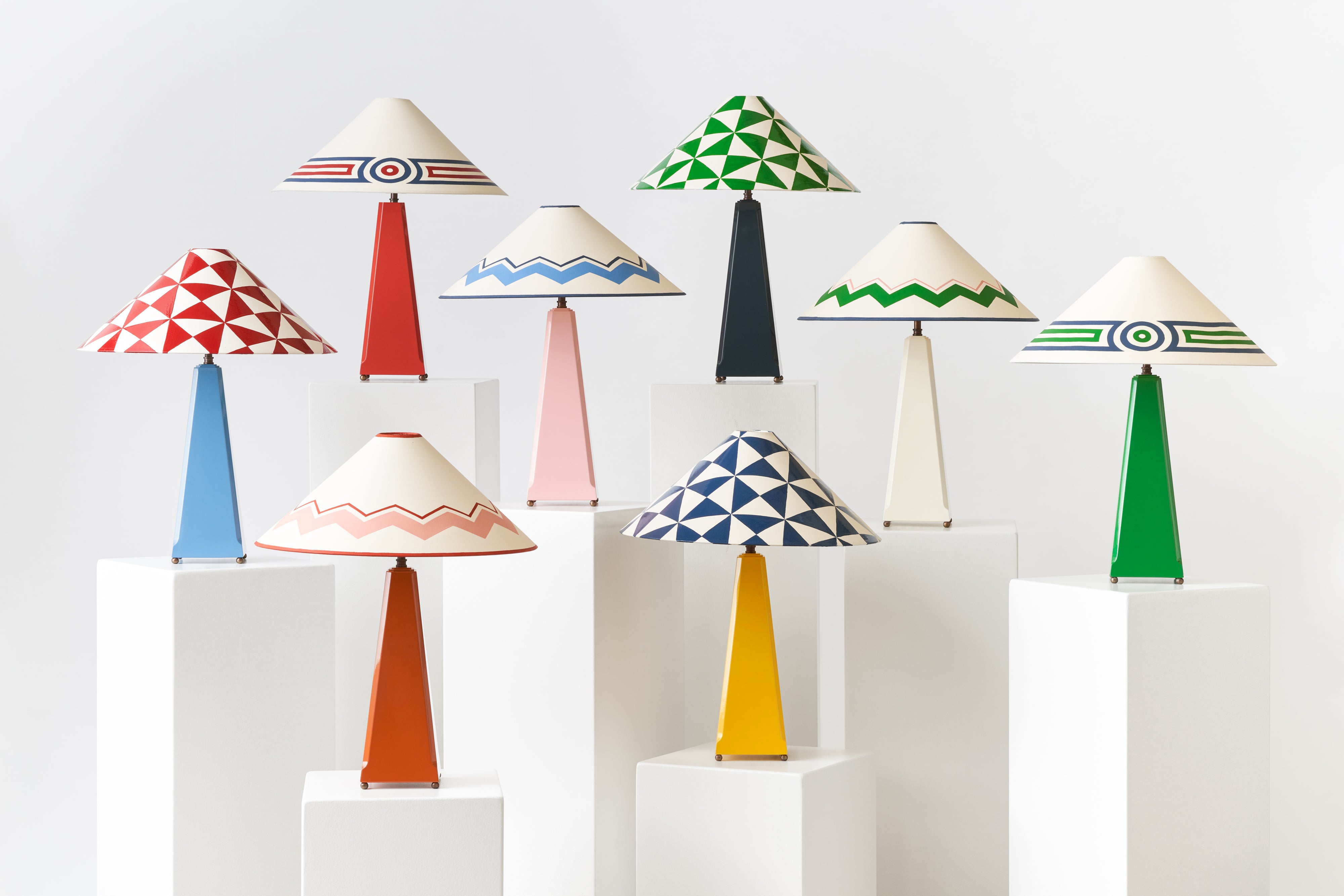Introducing Alvaro Picardo & Studio Atkinson's collaboration, which was inspired by Studio Atkinson's wallpaper border collection. Each lampshade has been meticulously handpainted and signed by Alvaro, and the vibrant colours and graphic designs make them a true statement piece.