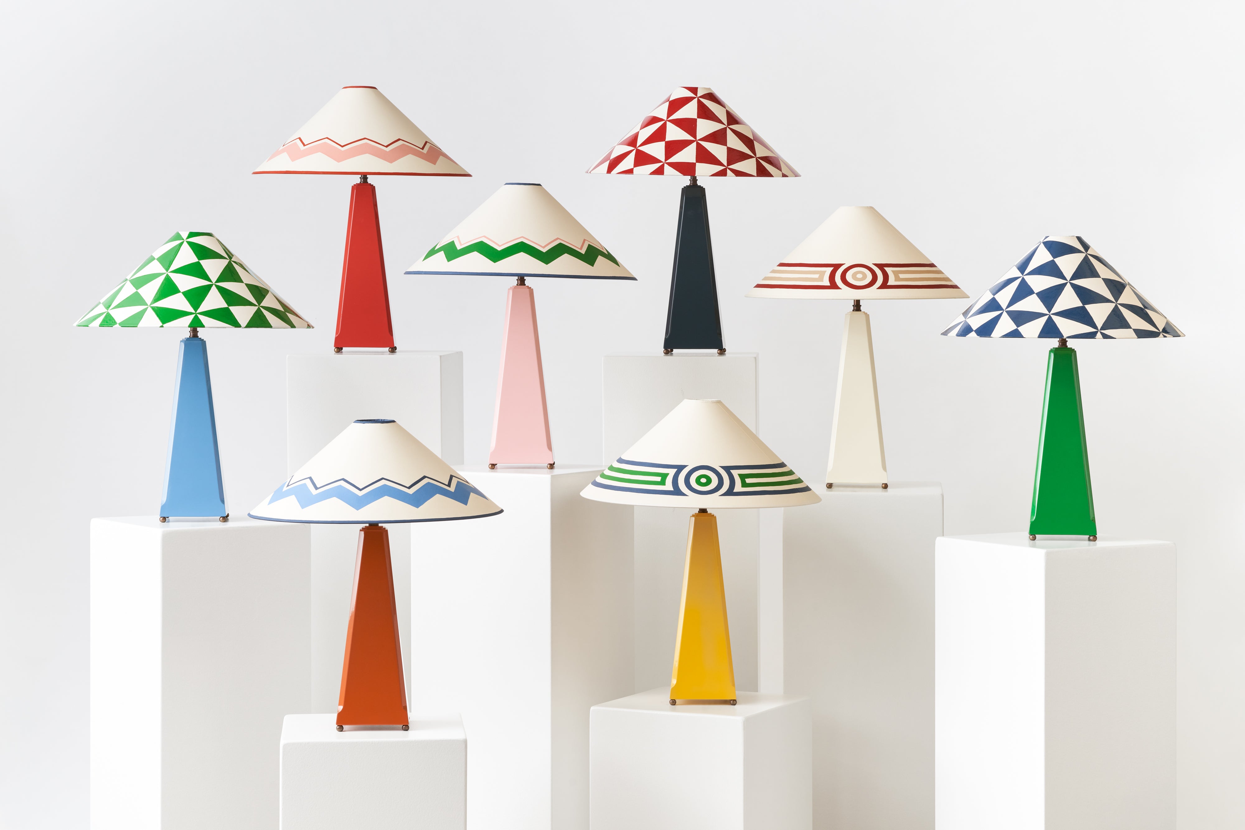 Introducing Alvaro Picardo & Studio Atkinson's collaboration, which was inspired by Studio Atkinson's wallpaper border collection. Each lampshade has been meticulously handpainted and signed by Alvaro, and the vibrant colours and graphic designs make them a true statement piece.