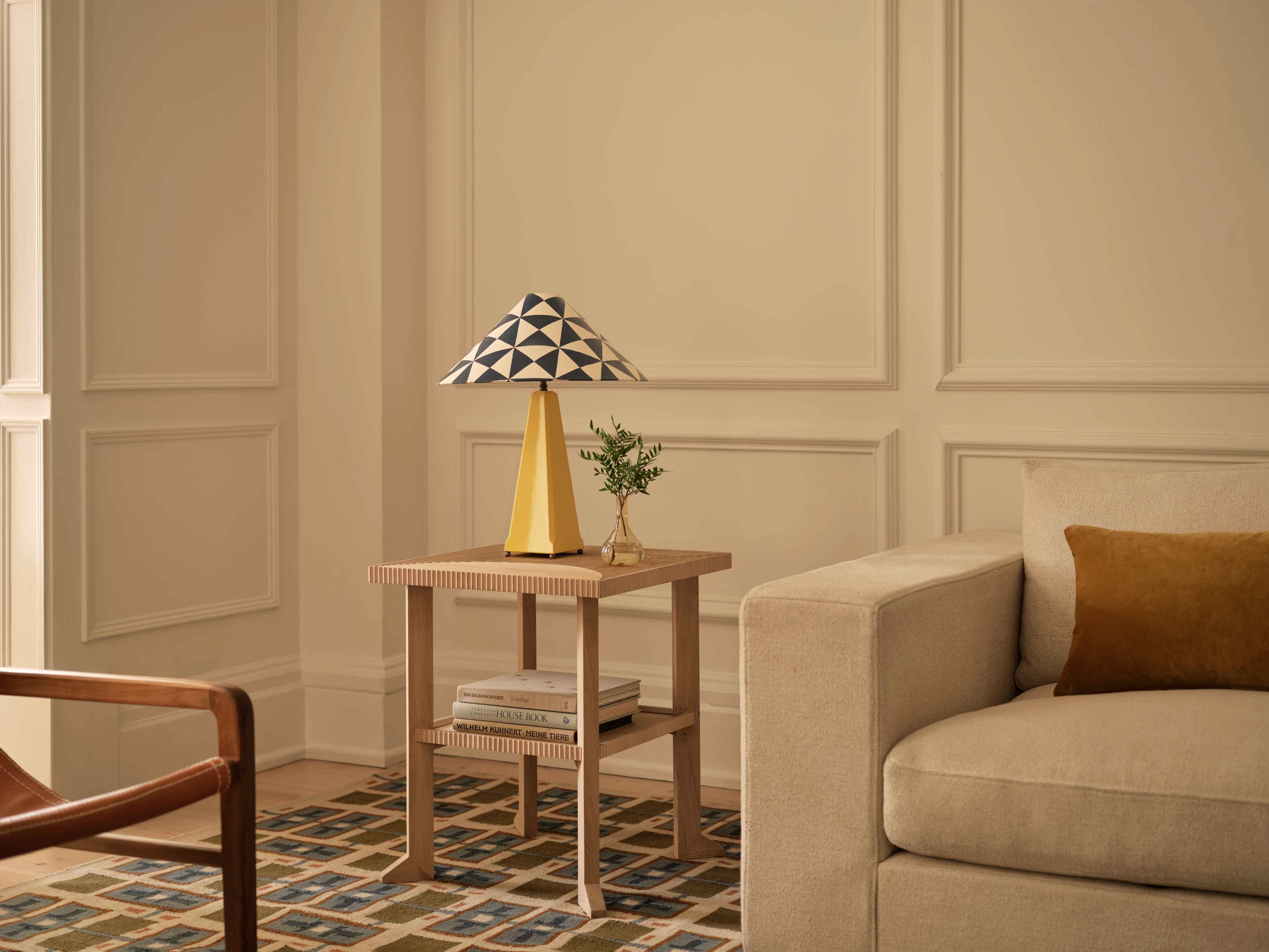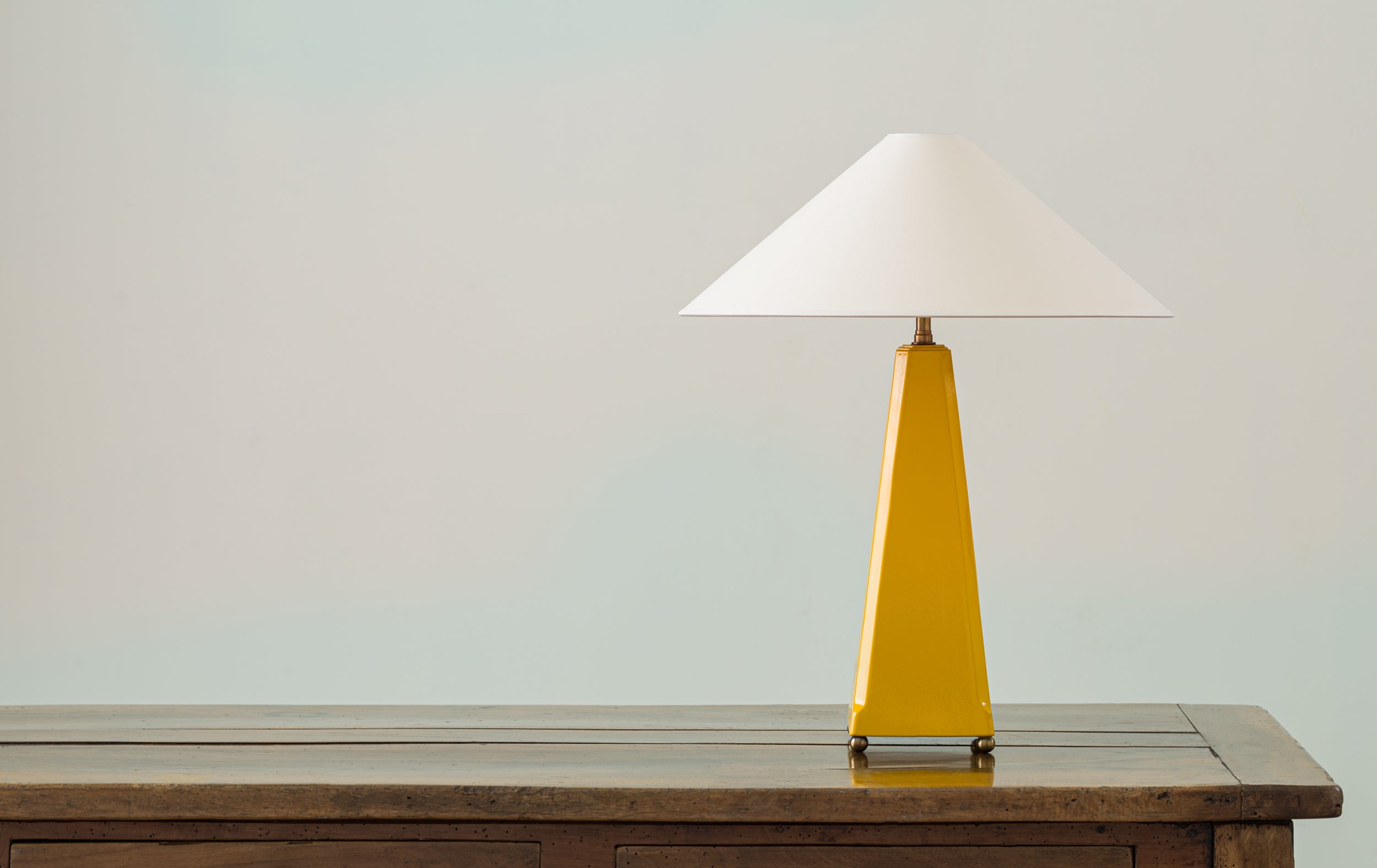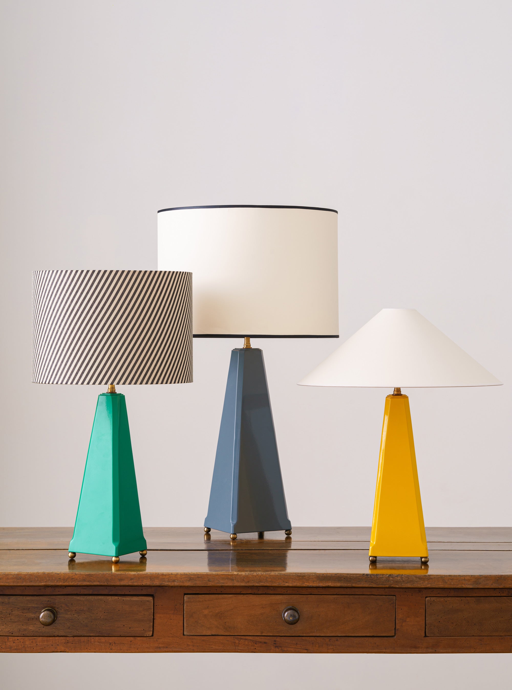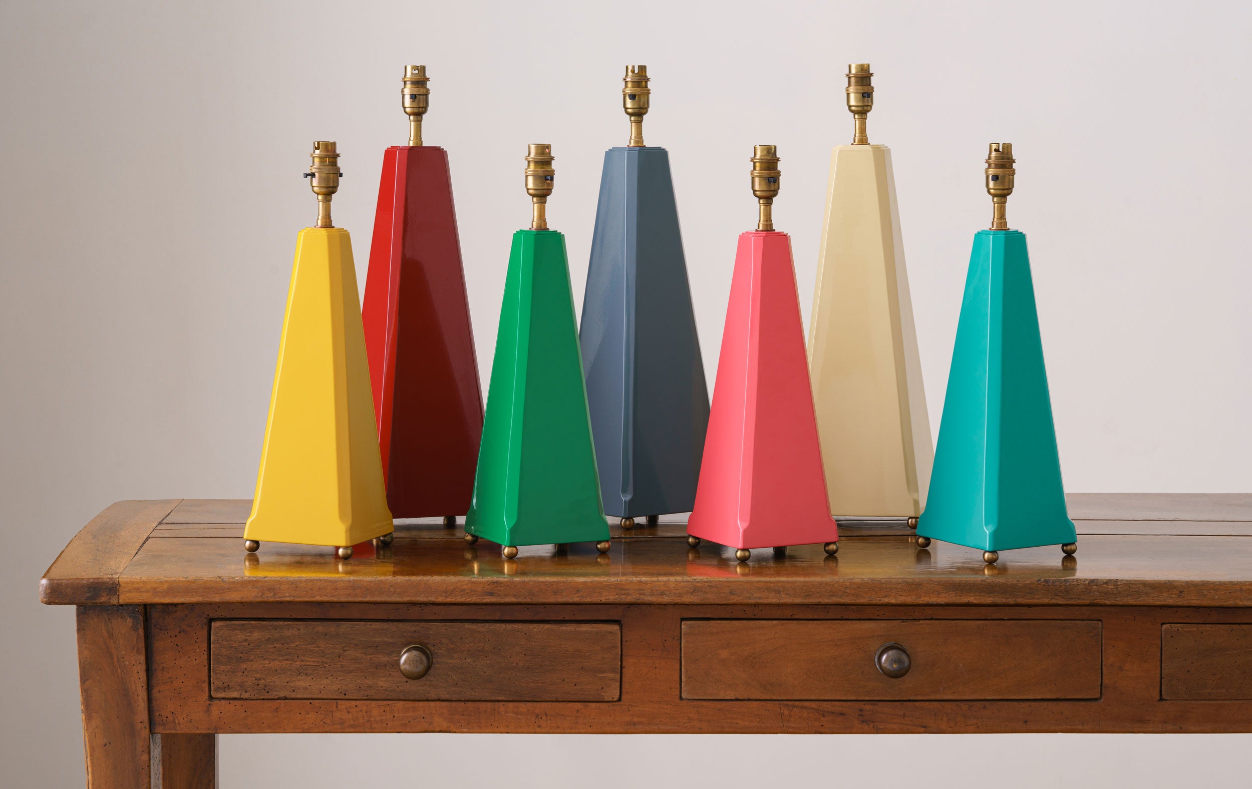 The Plato Lamp is handcrafted in the UK from wood and coated in bright, high gloss colours which gives the traditional shape a contemporary feel. The lights feature chamfered edges and are held up by spherical antique brass feet.