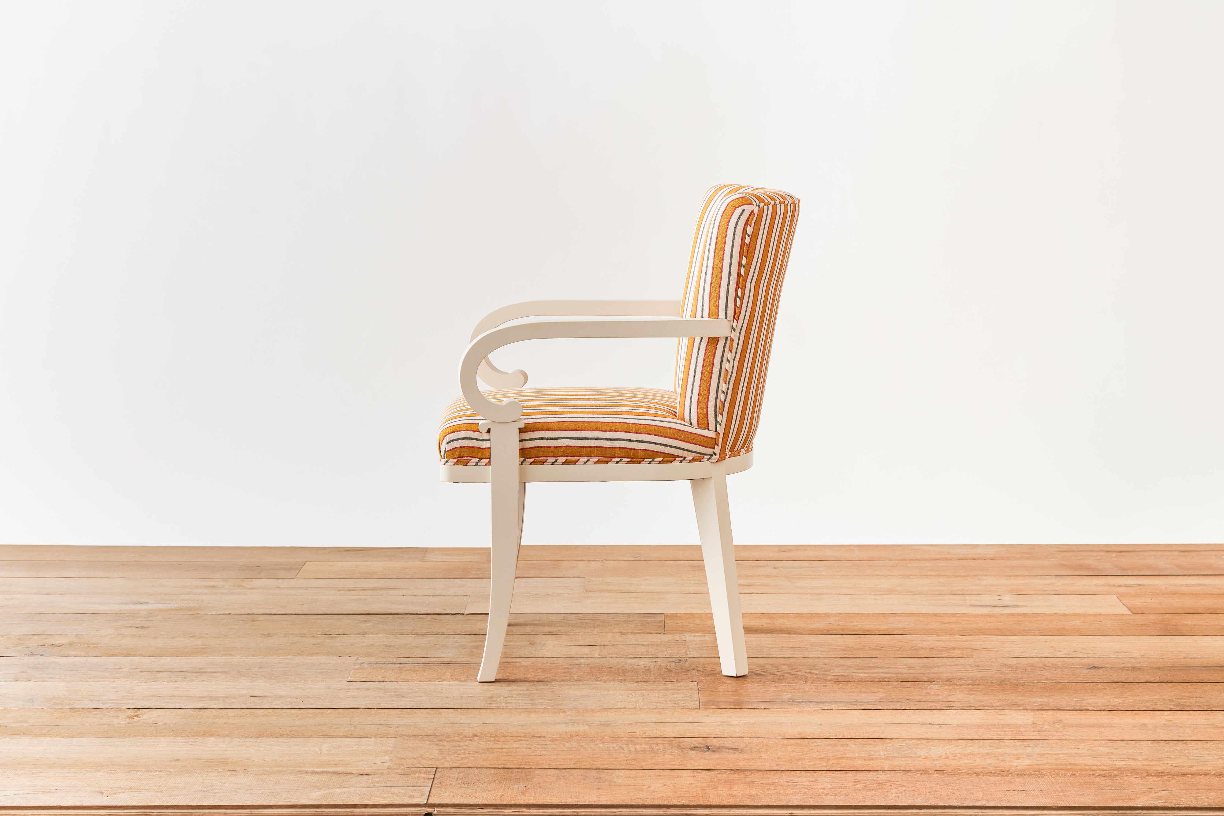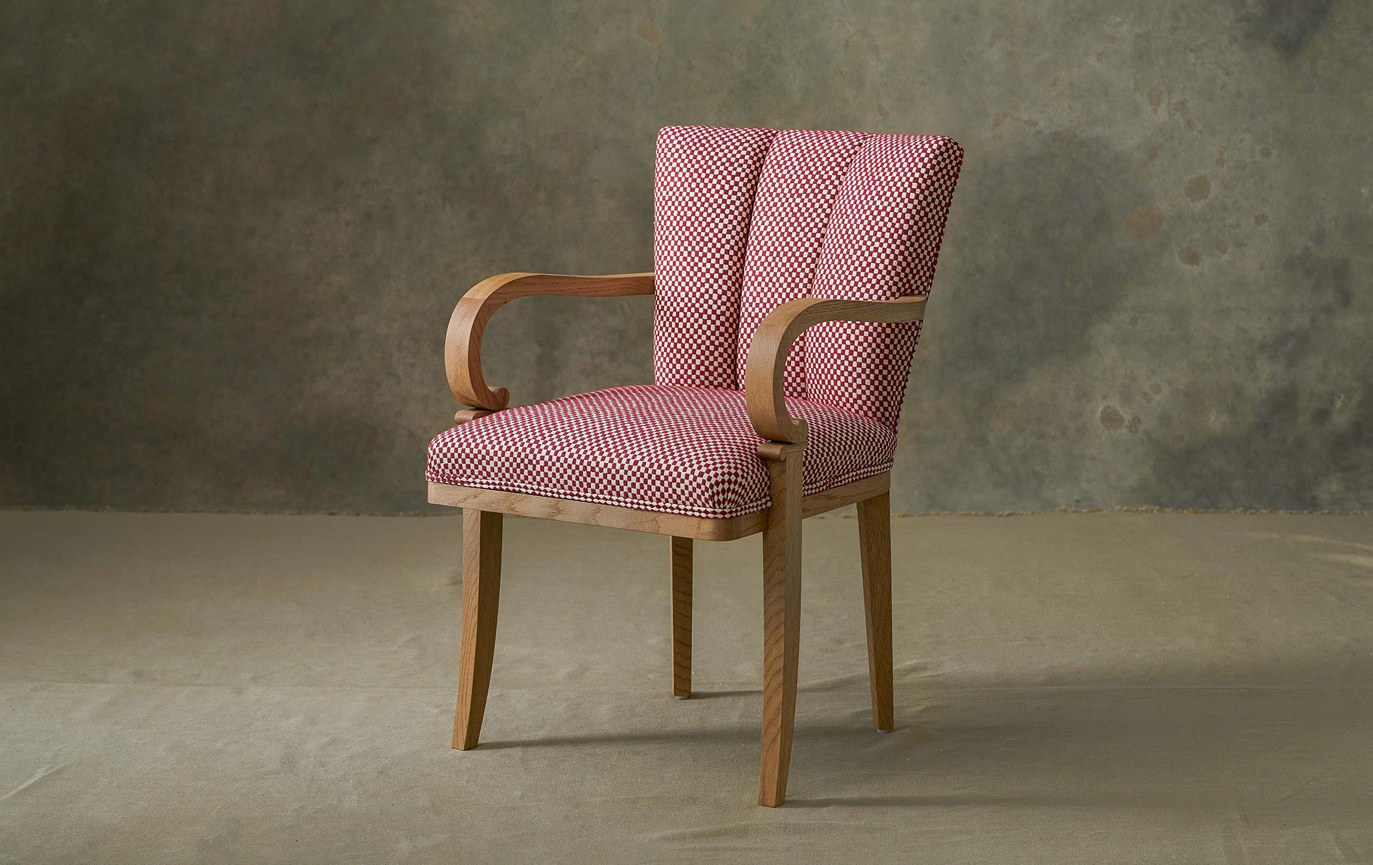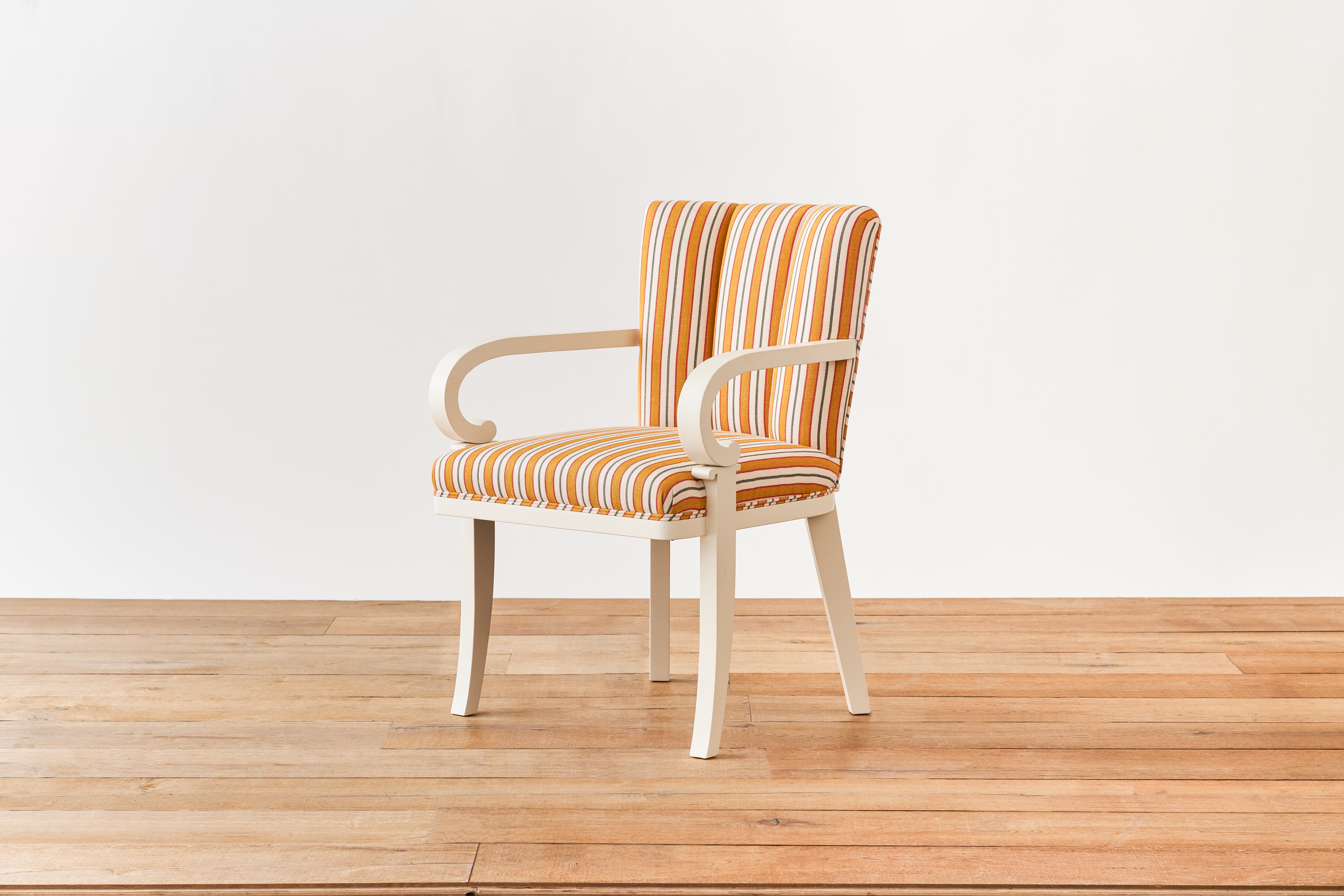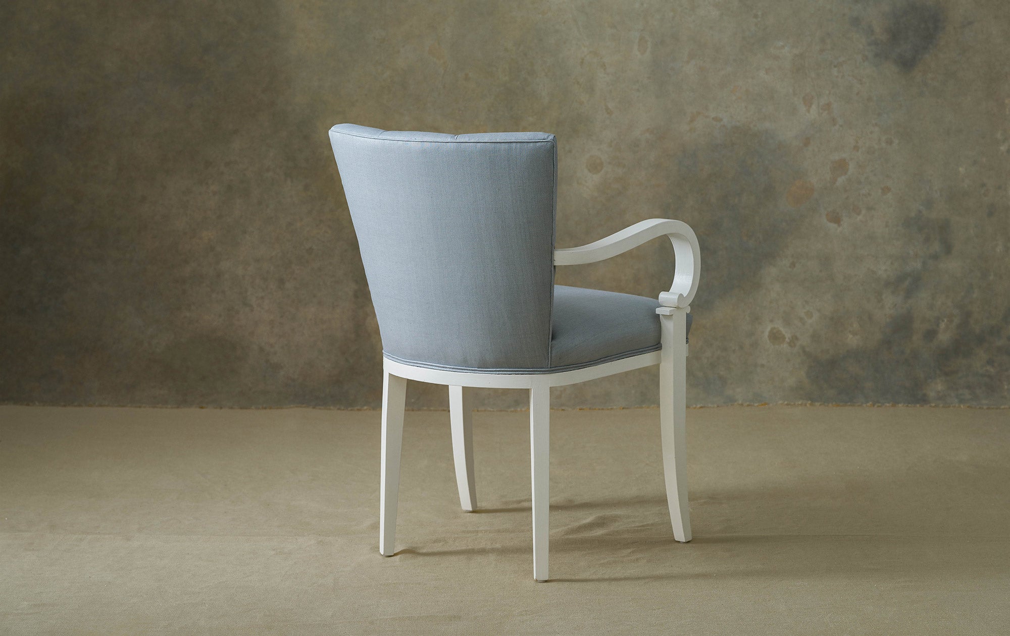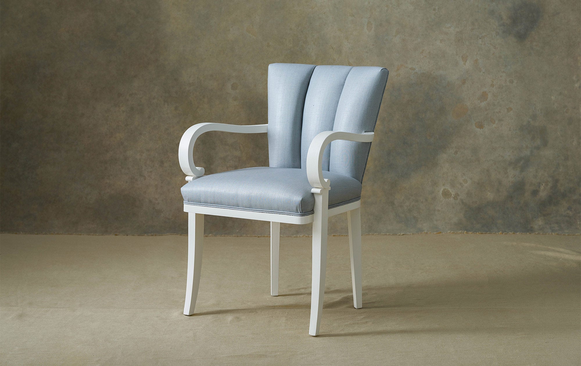 The Scroll Arm Chair is inspired by a French original, with tapered legs and a fluted back. It's extremely comfortable as a dining, side or dressing table.