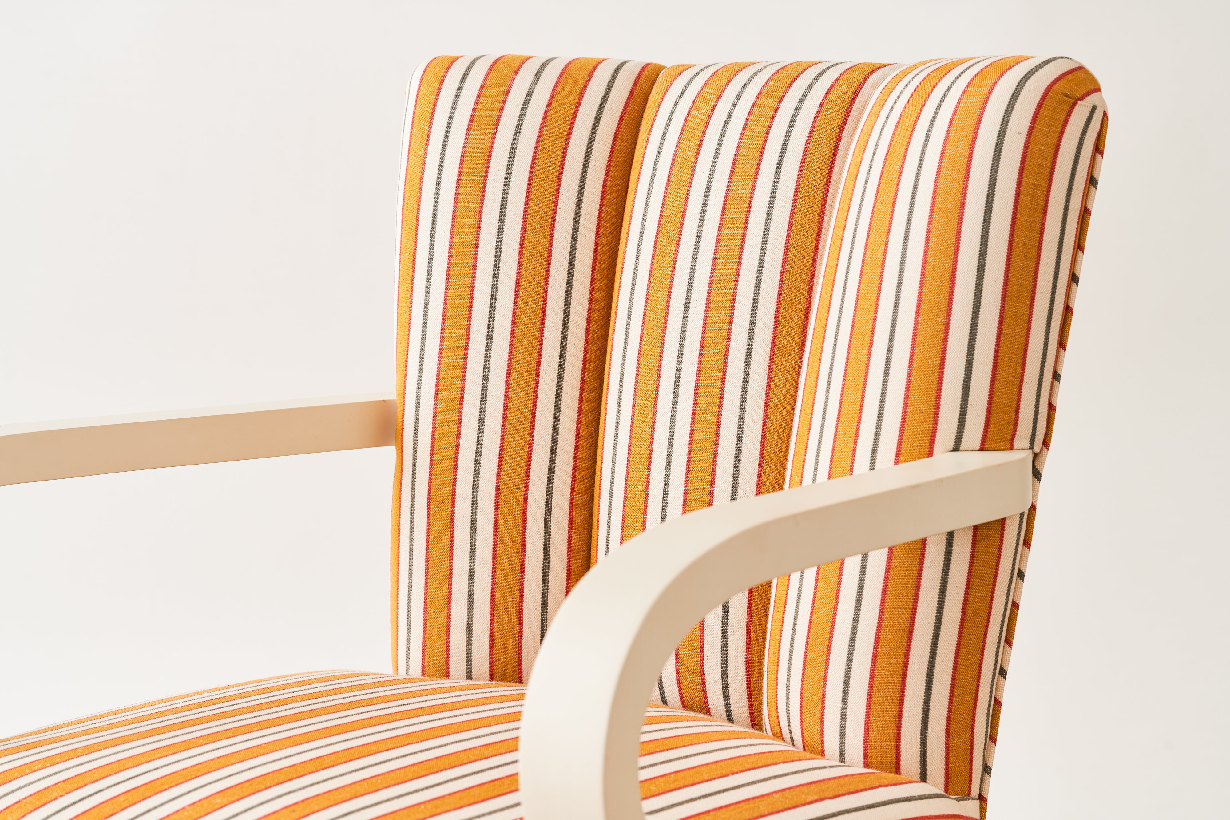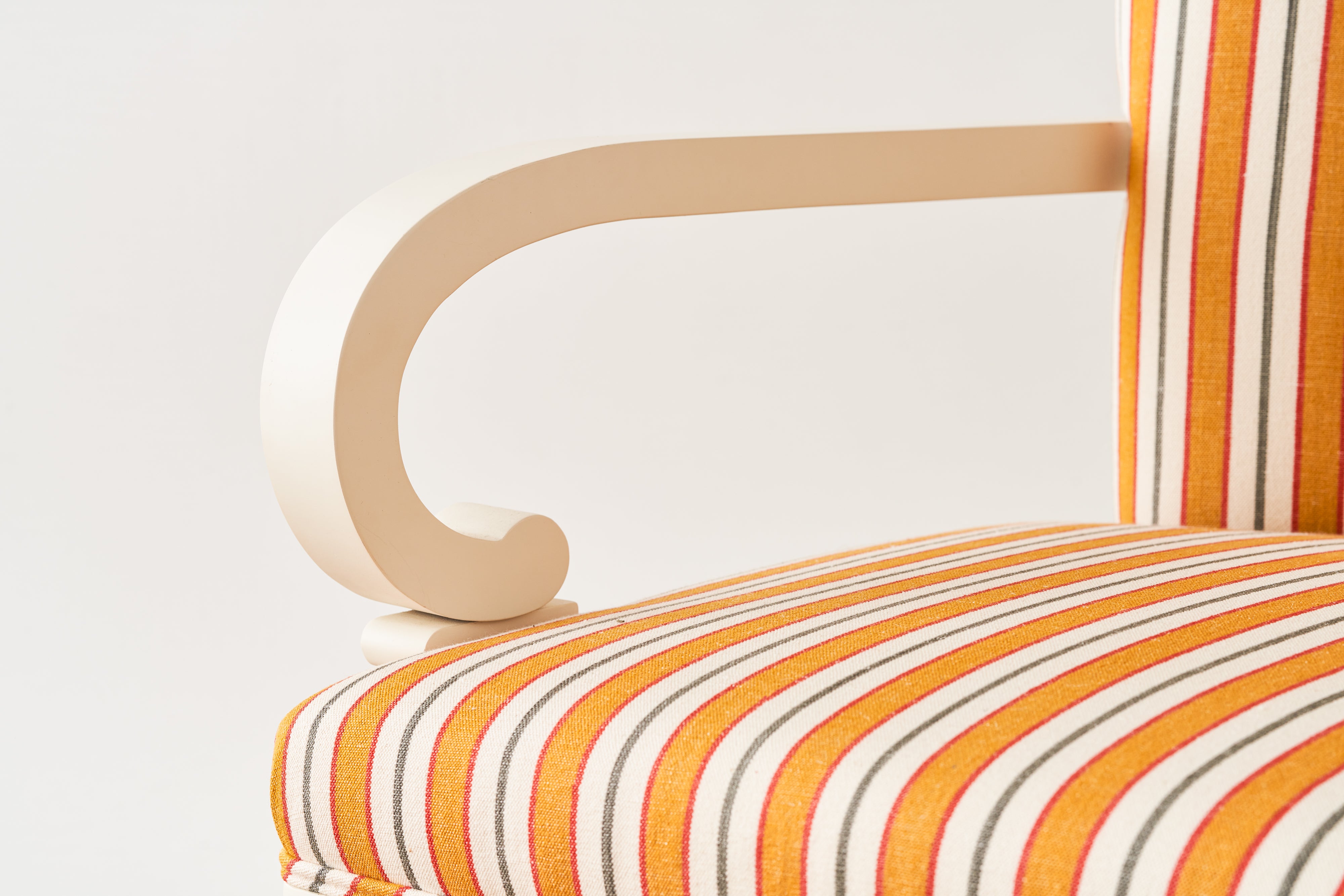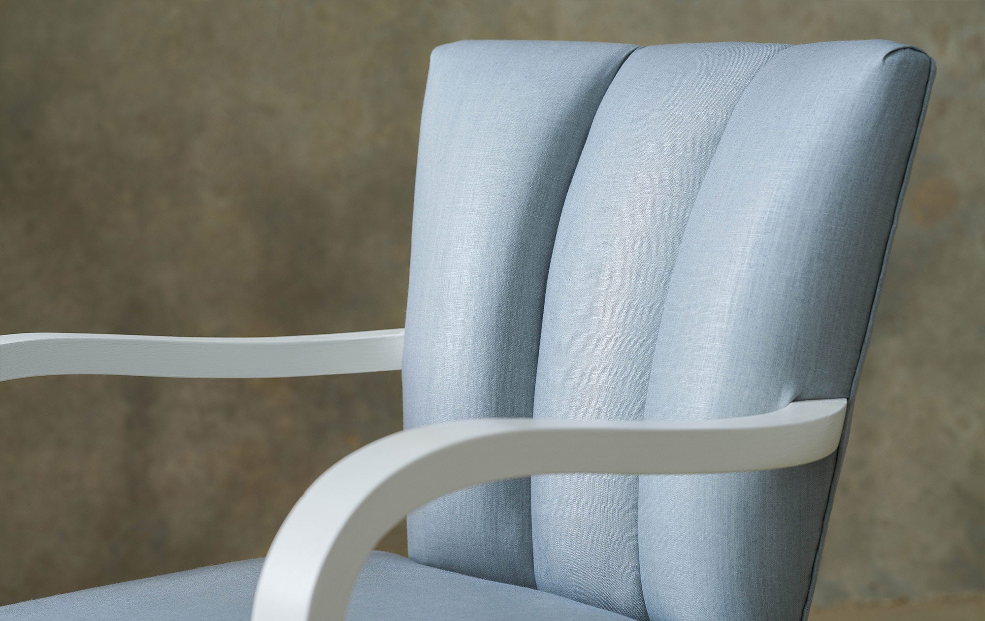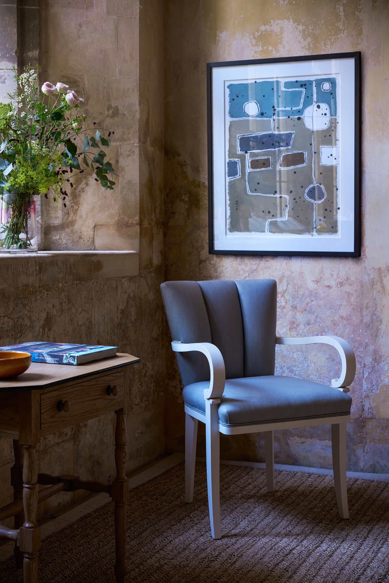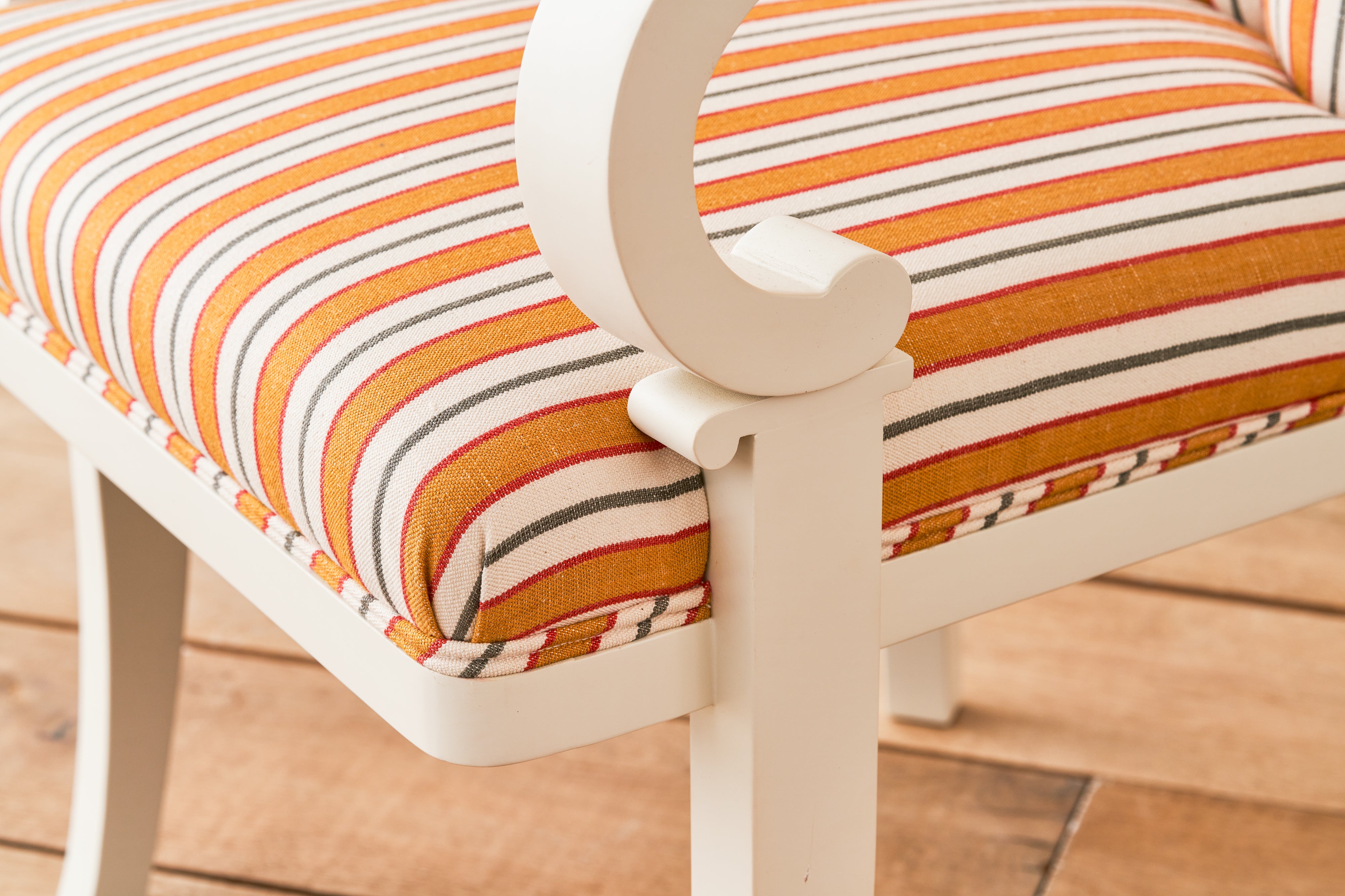 The Scroll Arm Chair is inspired by a French original, with tapered legs and a fluted back. It's extremely comfortable as a dining, side or dressing table.