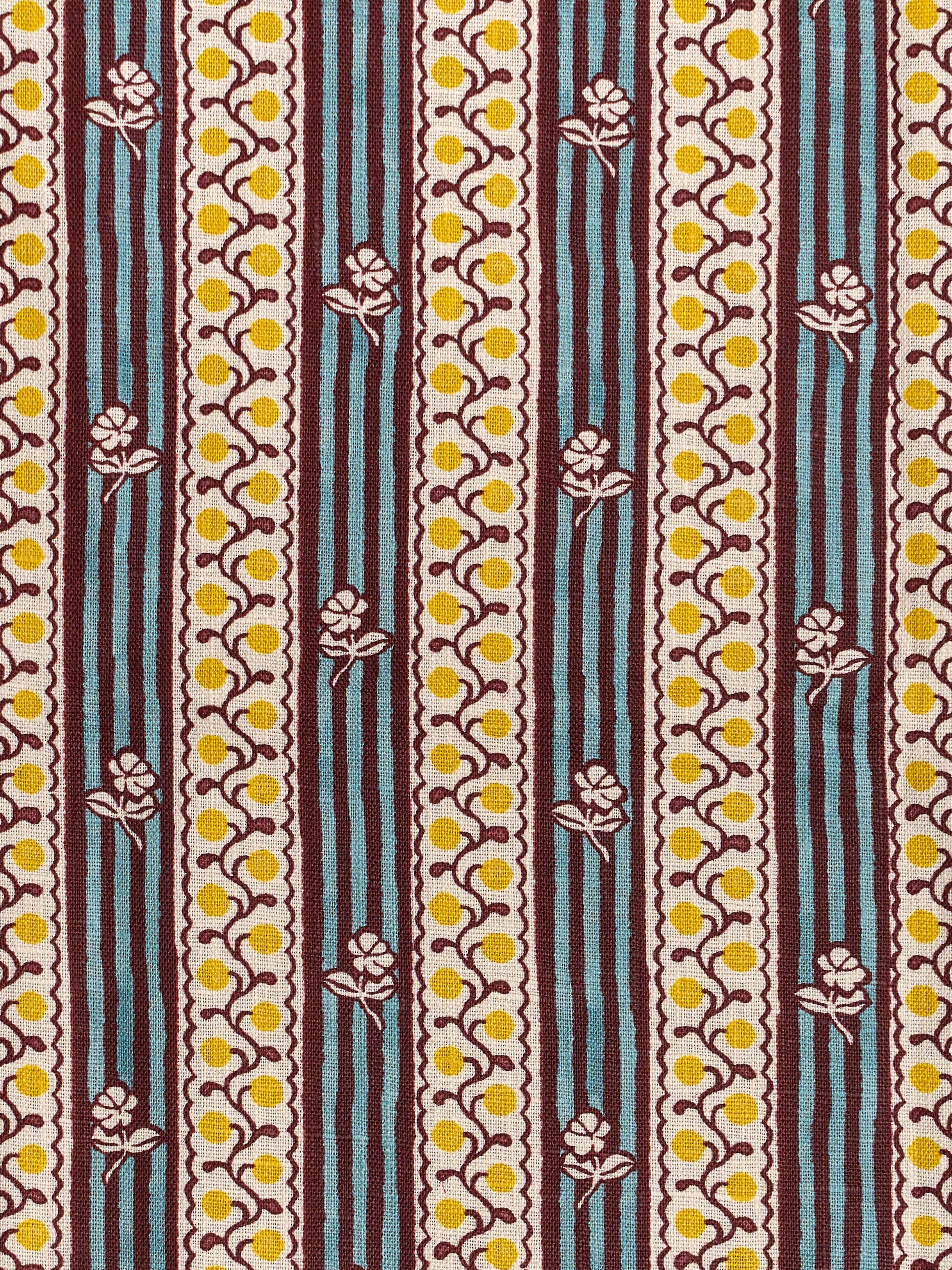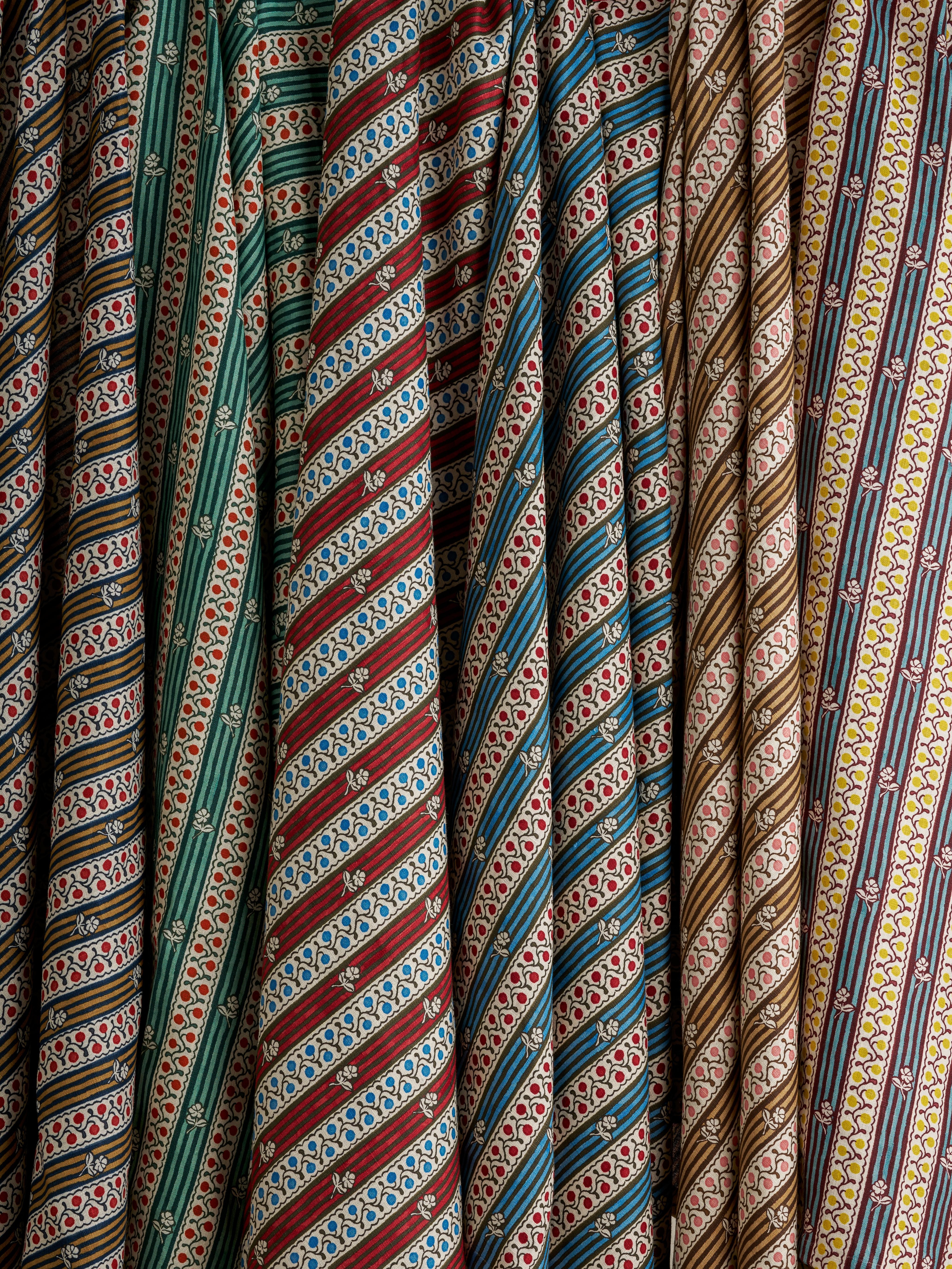 Woodland Rose Fabric is a printed linen floral fabric designed to bring a sense of quiet character to interiors. Studio Atkinson’s first floral collection, it combines a striped ground with a botanical motif to create a design that feels nostalgic yet contemporary. The pattern is deliberately balanced, giving the fabric a strength that allows it to sit comfortably in both masculine and feminine settings. The scale works equally well across small and large upholstered pieces, from headboards and chairs to curtains. Each colourway shifts the mood of the fabric, transforming how it reads within a space.